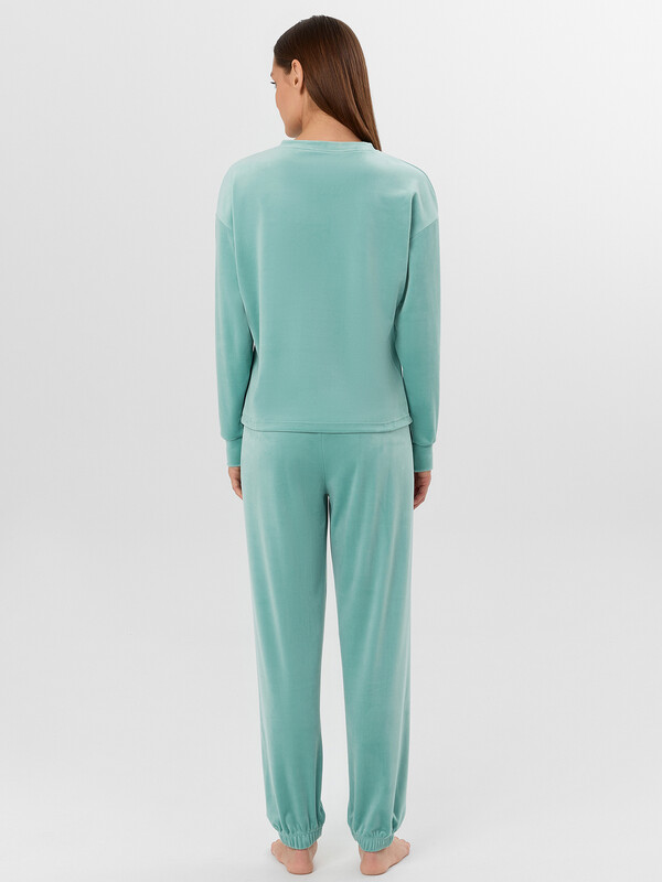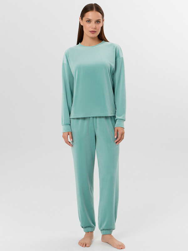 Джемпер с круглой горловиной и спущенной линией плеча обеспечивает комфорт и свободу движений. Длинные рукава с отрезными манжетами и аккуратная обработка низа добавляют модели долговечности. Брюки с эластичным поясом и манжетами на штанинах обеспечивают идеальную посадку и не сковывают движения. Мягкий велюр сохраняет тепло, приятен к телу и хорошо держит форму. Этот комплект станет идеальным выбором для отдыха дома, неспешных прогулок или уютных вечеров в кругу близких.