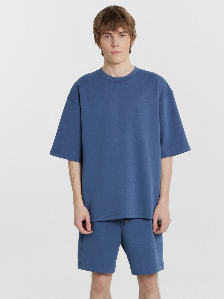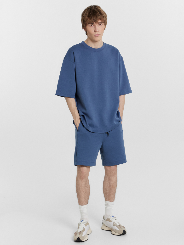 Мужской комплект станет отличным выбором для комфортного и стильного повседневного образа. Футболка прямого свободного кроя с круглой горловиной и слегка спущенной линией плеча добавляет расслабленный вид. Короткие рукава и обработка нижних срезов швом вподгибку обеспечивают аккуратный и завершенный вид. Шорты прямого свободного кроя длиной до колен создают удобство в движении, а эластичный пояс на кулиске позволяет подогнать посадку под индивидуальные предпочтения. Боковые карманы добавляют практичности и удобства. Изделие выполнено из интерлока — двойного трикотажа, известного своей прочностью, мягкостью и приятной текстурой. Он обладает высокой воздухопроницаемостью, эластичностью и долго сохраняет форму, не растягиваясь и не деформируясь. Этот материал обеспечивает комфорт в течение всего дня и идеально подходит для одежды, которая требует легкости и долговечности. Такой комплект идеально подходит для отдыха дома, прогулок или занятий спортом, сочетая функциональность и стиль. Комфортный и универсальный выбор для любого дня.