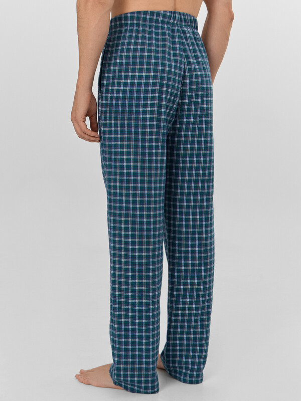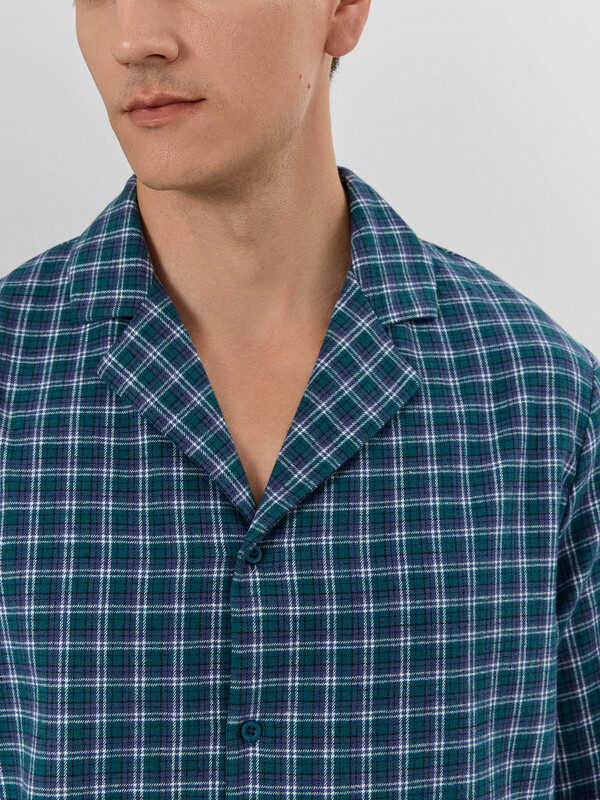 Мужской домашний комплект в классическую клетку станет идеальным спутником для отдыха. Пижама, состоящая из рубашки и брюк, выполнена из хлопка, который дарит коже приятные ощущения и обеспечивает комфорт весь день. Свободная рубашка прямого силуэта с V-образным вырезом и отложным воротником выглядит элегантно и не сковывает движений. Длинные рукава со спущенным плечом и аккуратно обработанными манжетами дополняют образ. Прямые брюки с удобным цельнокроеным поясом на эластичной тесьме мягко сидят по фигуре. Практичные боковые карманы и аккуратная обработка низа подчеркивают качество исполнения.