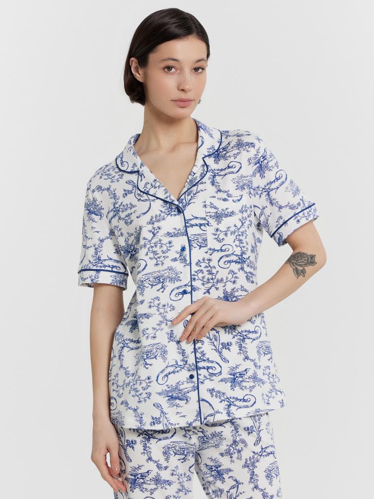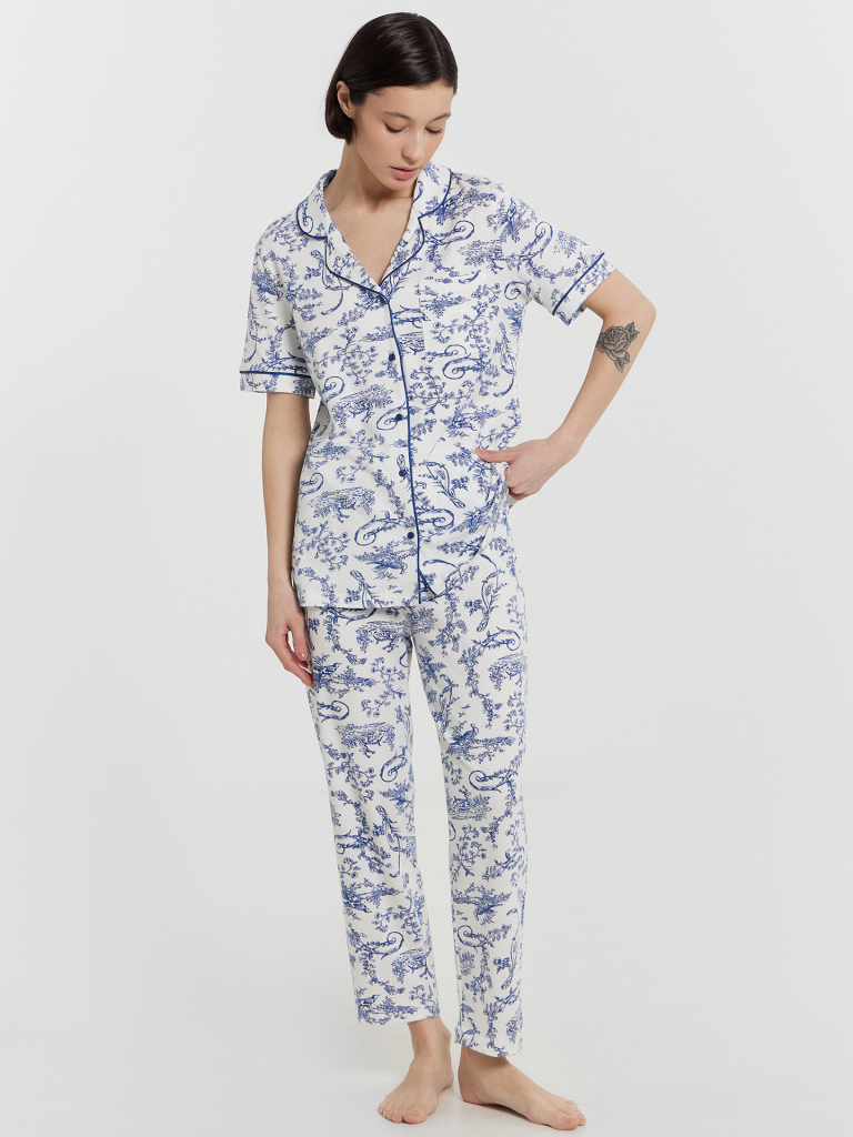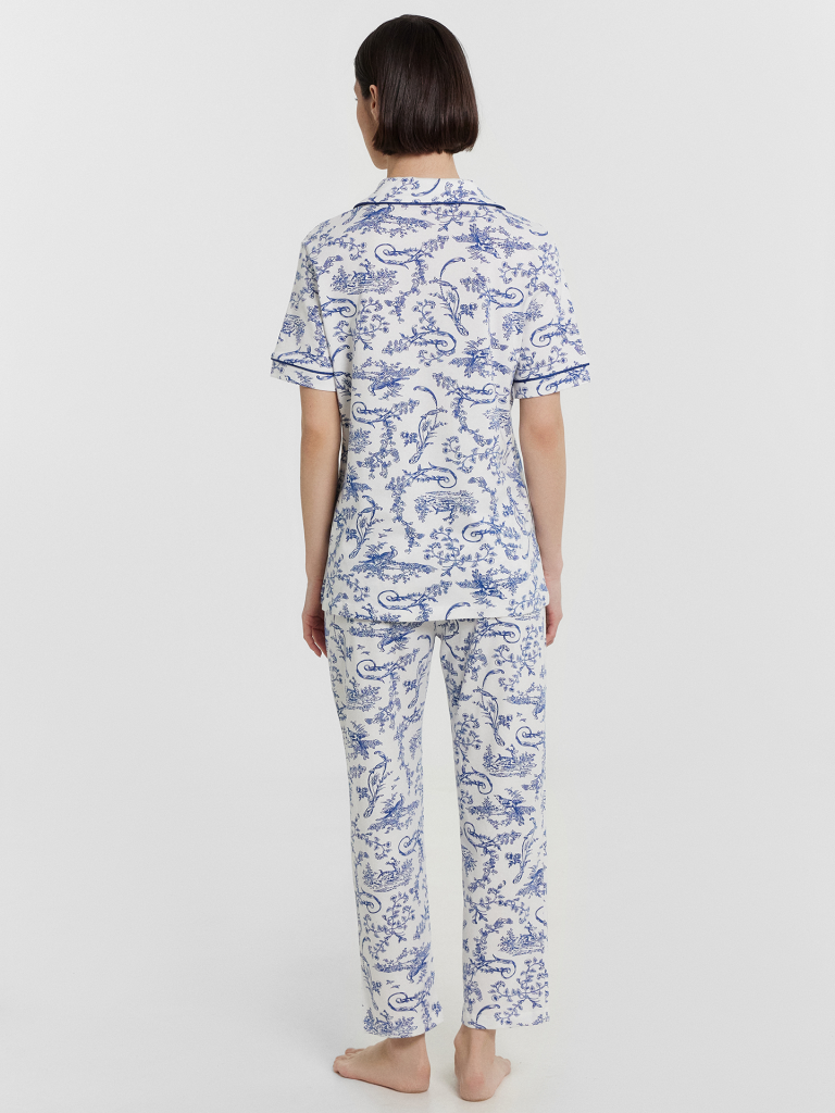 Комплект состоит из джемпера и бридж. Жакет прямого силуэта, спинка цельнокроеная. На левой детали переда накладной карман ( по заданию). Горловина оформлена отложным воротником с лацканами. Край борта и воротника оформлен кантом. Рукав втачной короткий, низ рукавов обработан манжетой с втачным кантом. Жакет с центральной застежкой с петлями и пуговицами. Низ застрочен в подгибку.