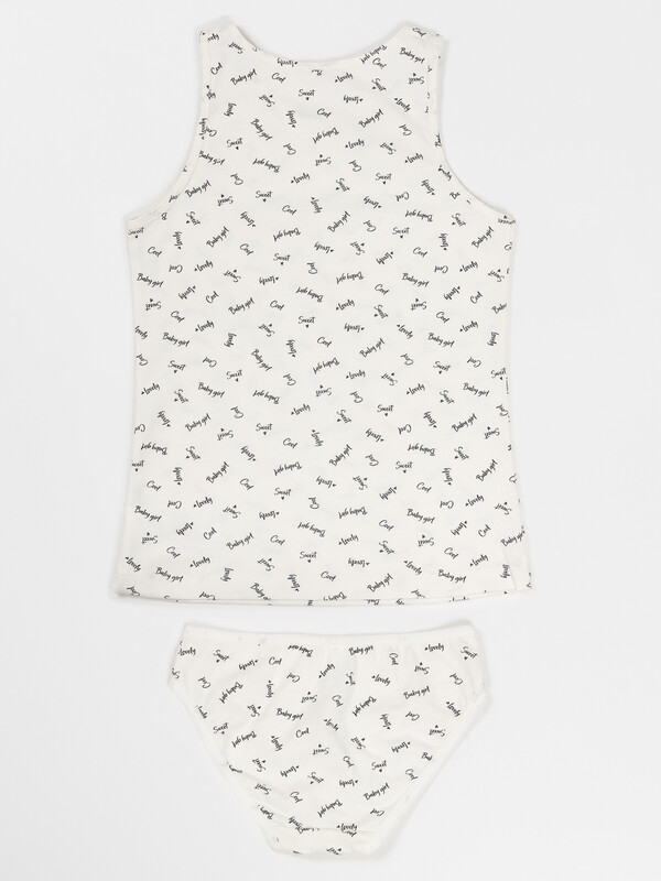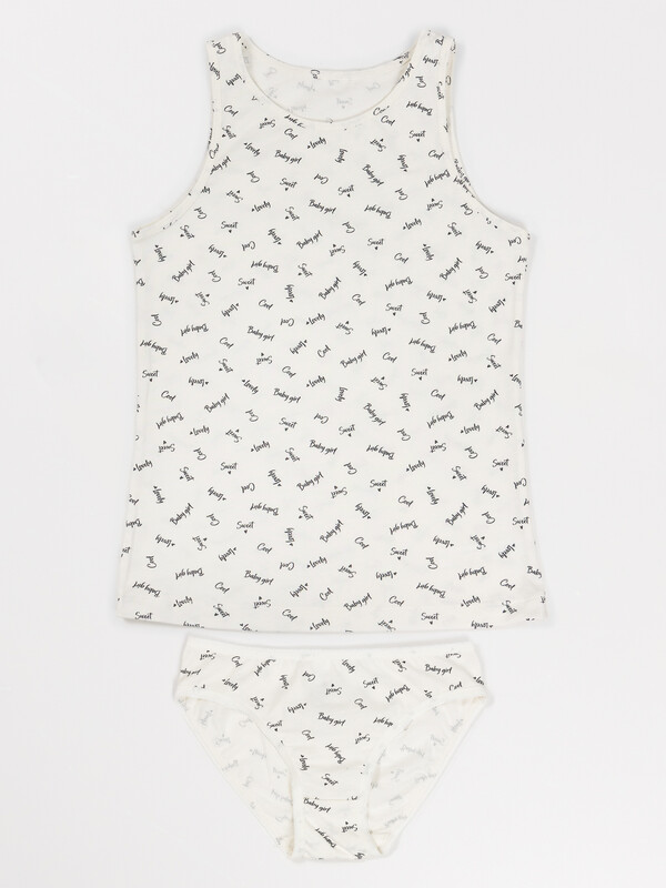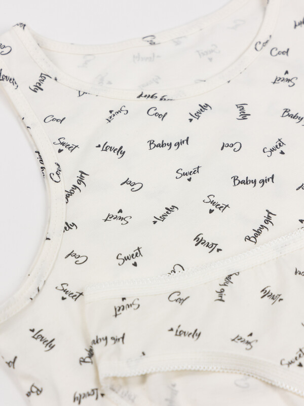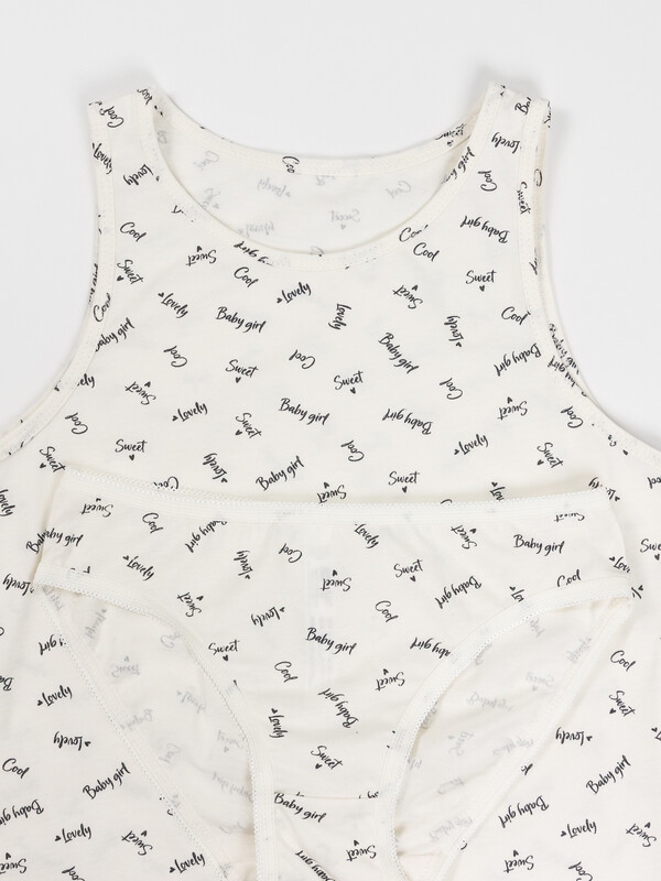 Бежевый комплект для девочек с надписями станет любимым набором в гардеробе юной модницы. Комплект включает полуприлегающую майку с круглым вырезом и трусики с заниженной линией талии. Нежный бантик в зоне декольте добавляет образу очарования.