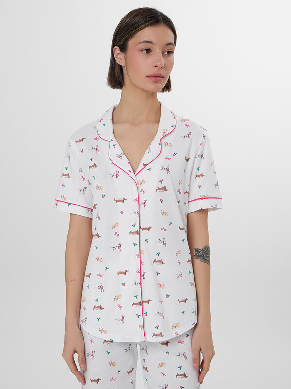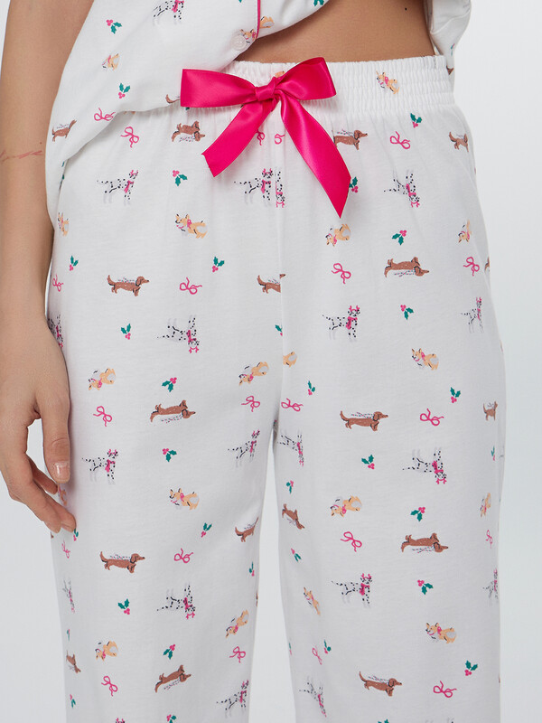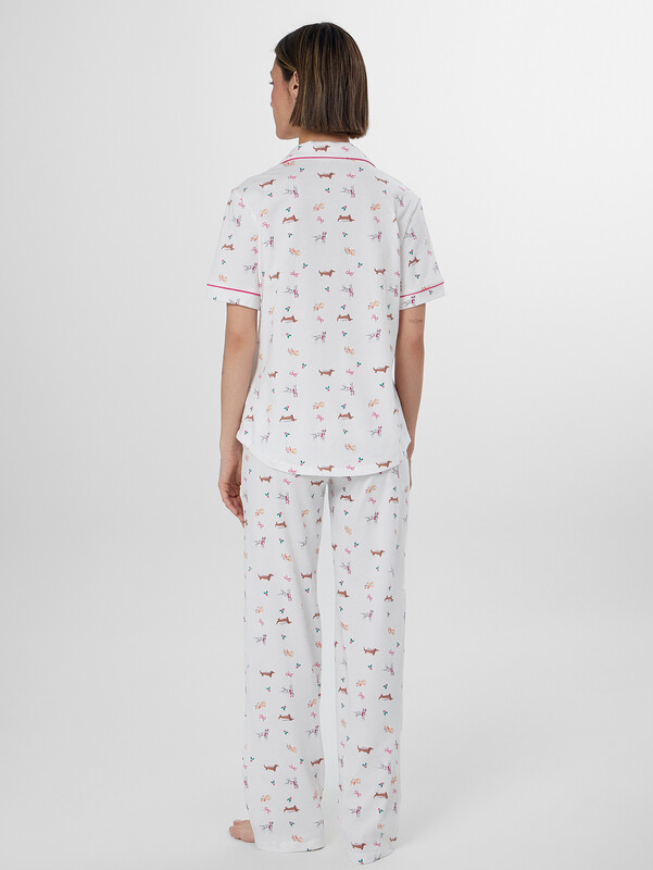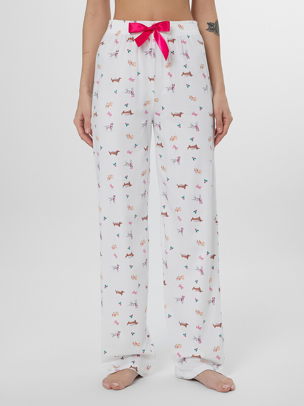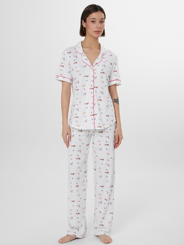 Комплект женский состоит из жакета и брюк. Жакет прямого силуэта, спинка цельнокроеная. Горловина оформлена отложным воротником с лацканами. Край борта и воротника оформлен кантом. Рукав втачной короткий, низ рукава обработан манжетой с втаченным кантом. Жакет с центральной застежкой с петлями и пуговицами. Низ застрочен швом в подгибку. Брюки с посадкой на талии свободного силуэта. Пояс цельнокроеный с резиной внутри. Низ брюу застрочен швом в подгибку