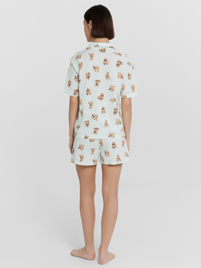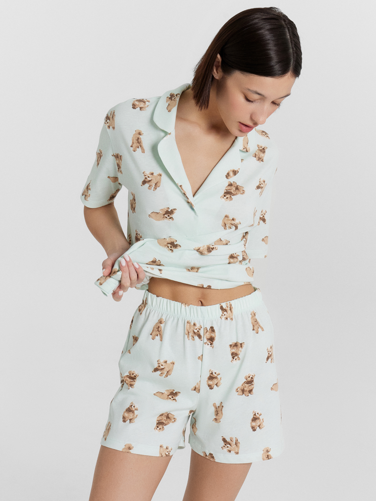 Комплект женский состоит из рубашки и шорт. Рубашка свободного силуэта, с отложным воротником. Рукав втачной короткий, линия плеча немного спущена, рукав обработан вподгибку. Рубашка с центральной застежкой с петлями и пуговицами. Низ застрочен швом в подгибку.