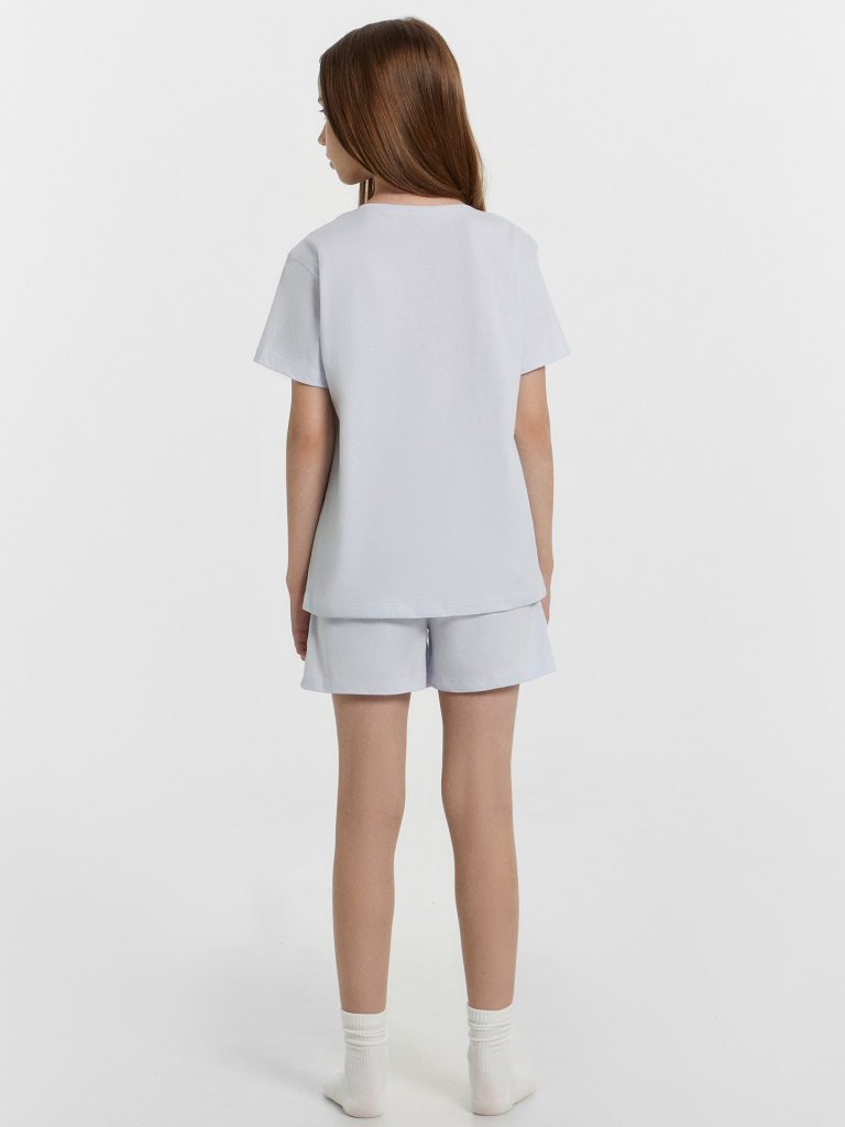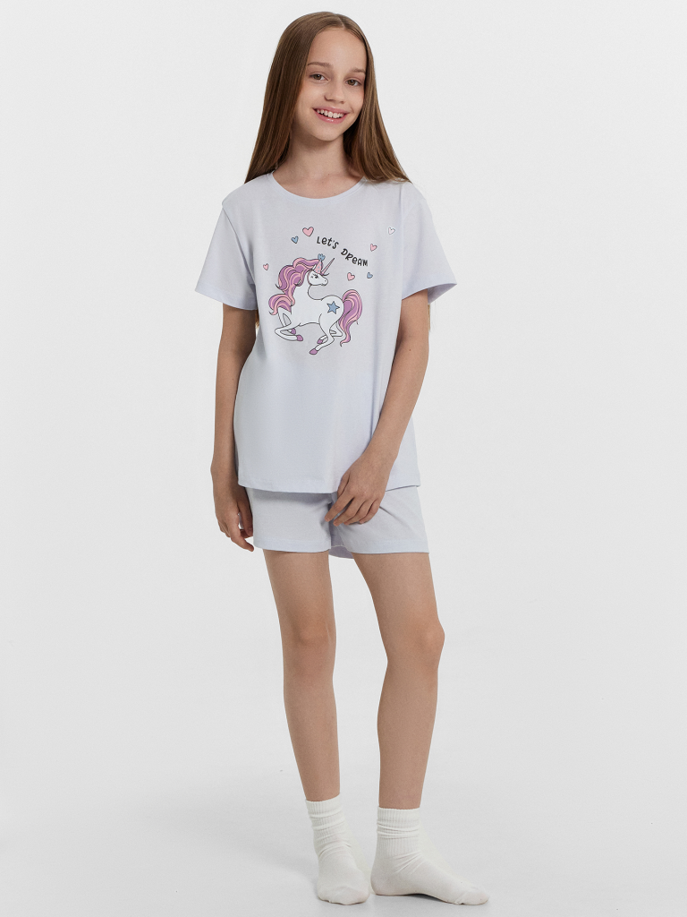 Комплект для девочки, состоит из футболки с короткими рукавами и шорт из натурального хлопка. Подходит для сна и отдыха. Материал очень приятный к телу, хорошо пропускает воздух, что позволяет чувствовать себя комфортно даже в жаркую погоду. Идеальный выбор детской одежды для дома. Стильно, красиво, комфортно. Футболка декорирована интересным принтом, шортики однотонные. Широкий размерный ряд, базовые и яркие расцветки, модели с принтами, рисунками и печатями. Купите детскую пижаму для девочки от Mark Formelle, порадуйте ребенка красивым и стильным подарком!
