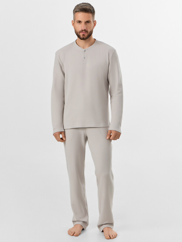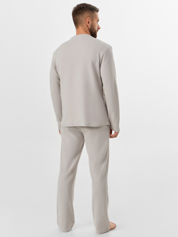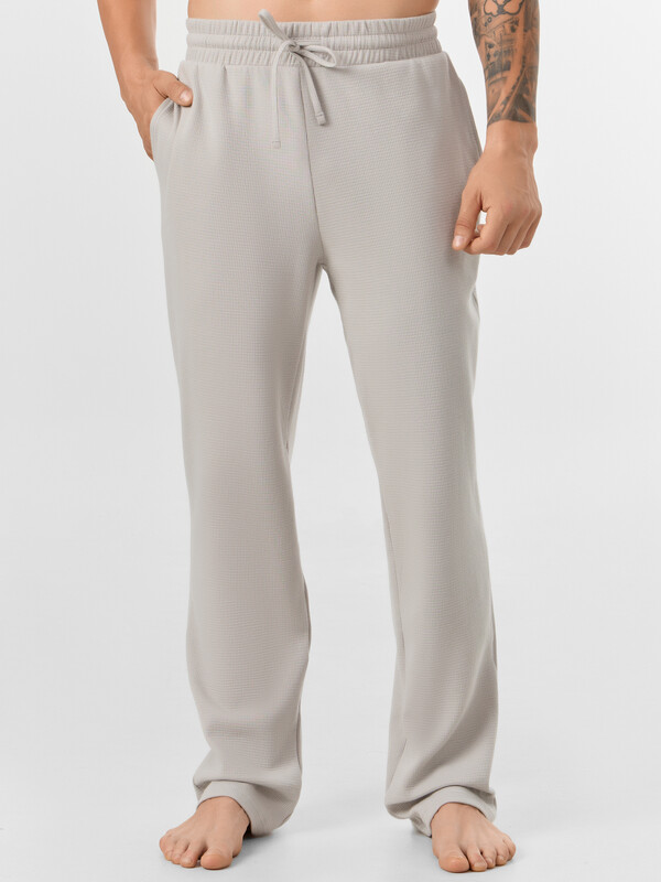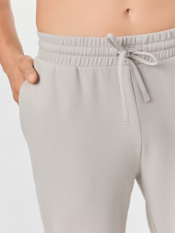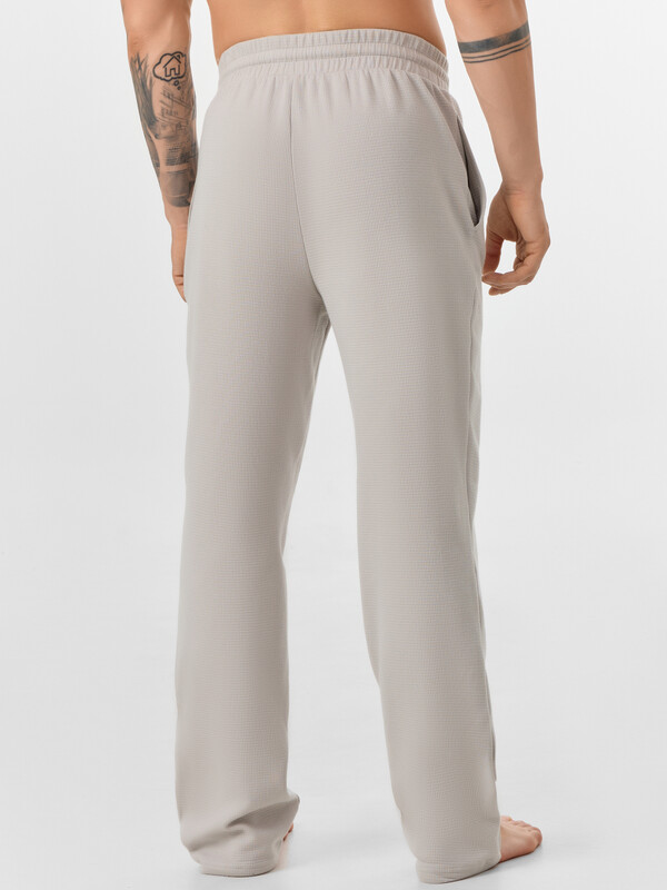 Брюки прямого силуэта, с классической линией талии. Пояс отрезной, с эластичной тесьмой внутри (60мм). На передней части пояса пробиты петли и втянут шнур бейка из основного полотна. В боковых швах обработаны карманы. Подкладка кармана из основного полотна.
