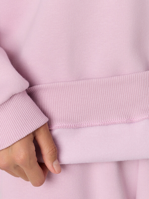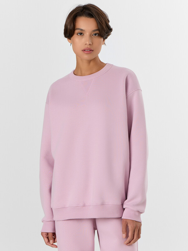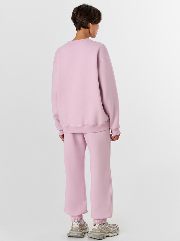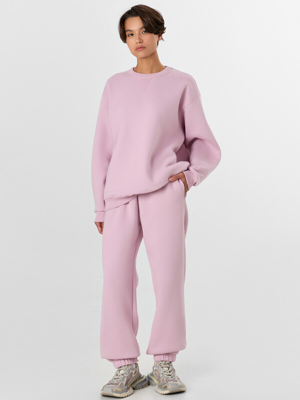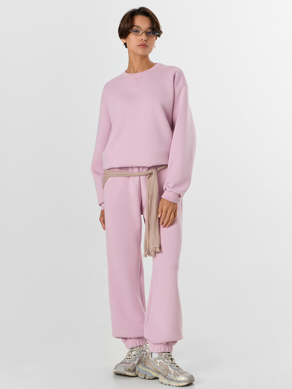 Нежно-розовый женский костюм, состоящий из джемпера и джоггеров, создан для повседневного комфорта. Джемпер свободного кроя с мягким внутренним начесом отлично согревает. Круглая горловина, низ изделия и манжеты рукавов отделаны эластичной резинкой-рибаной для удобной посадки. Спереди у горловины настрочен декоративный треугольник из той же резинки. Швы выполнены аккуратно и не ощущаются при носке.