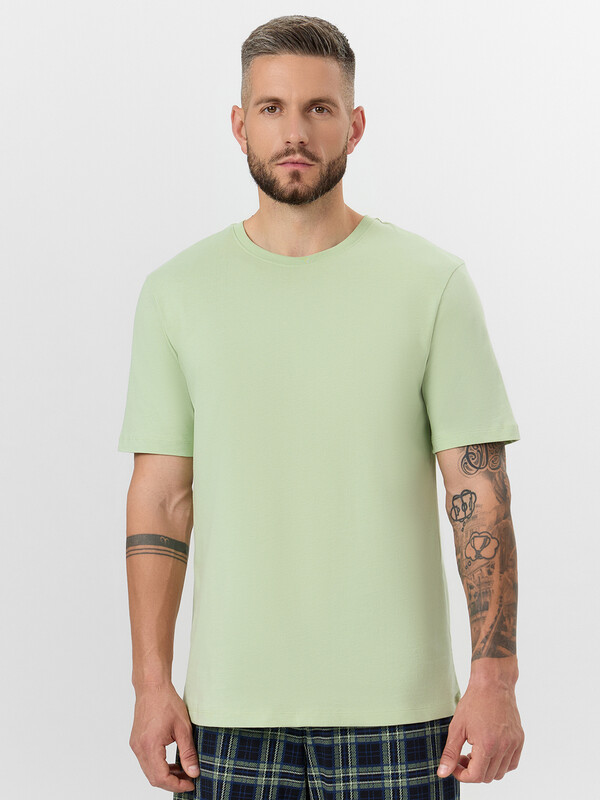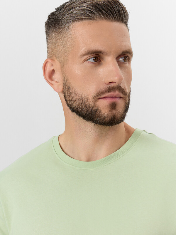 Футболка прямого силуэта с округлой горловиной оформлена мягкой обтачкой из рибаны. Особое внимание уделено деталям: шов по спинке аккуратно закрыт бейкой из основного полотна, а нижние срезы и рукава обработаны аккуратным швом.