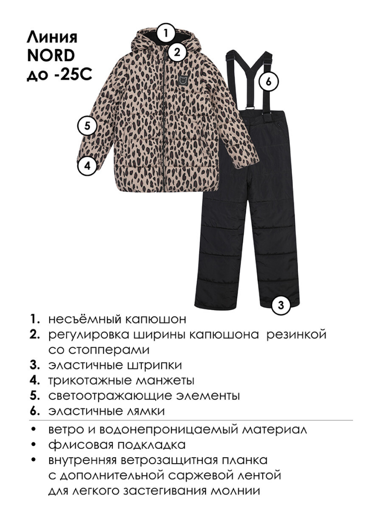 Зимний комплект: куртка, полукомбинезон. Линия Nord - высокая степень теплозащиты. Температурный режим до -25С.Подкладка - флис. Материал верха с ветрозащитным и водоотталкивающим покрытием. Внутренняя ветрозащитная планка. Два боковых кармана на липучке с флисовой подкладкой. Несъёмный нерегулируемый капюшон с внутренней резинкой. Эластичные манжеты на рукавах. Полукомбинезон на молнии. Внутренний снегозащитный манжет на брюках с резинкой snow stopper. Светоотражающие элементы.*температурный режим является рекомендованным, необходимо учитывать уровень активности ребенка и многослойность поддевочной одежды.