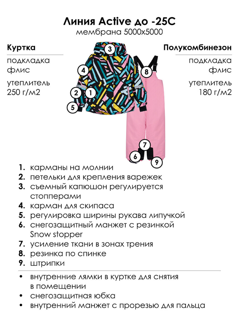 Зимний детский горнолыжный костюм для мальчика. Особенности модели: Линия Active, Температурный режим до -25С, мембрана 5000х5000, Куртка: подкладка - флис,Утеплитель 250 г/м, боковые карманы на молнии,съемный капюшон с утяжкой по ширине резинкой со стопперами,защита подбородка при застегивании молнии,внешняя ветрозащитная планка на липучках,эргономичные рукава,на рукаве карман для скипаса,регулировка ширины рукава липучкой, внутренние лямки для снятия в помещении,снегозащитная юбка с резинкой Snow stopper, Полукомбинезон: Утеплитель 180 г/м подкладка - флис,снегозащитный манжет на брюках с резинкой Snow stopper,усиление по внутреннему шву,резинка по спинке,штрипки, Утепленный горнолыжный комплект - идеальный выбор для активного отдыха на свежем воздухе в зимний период. Инновационный утеплитель и флисовая подкладка сохраняют тепло морозную погоду.Мембранный материал делает этот яркий и модный комбинезон непромокаемым: мембрана не пропускает влагу снаружи, но выводит её изнутри, что крайне важно во время подвижных игр и занятий спортом. Легкий, теплый и удобный, комплект идеально подходит для спорта, лыж, сноуборда и игр на свежем воздухе в холодный период года: зима, поздняя осень и ранняя весна. *Пожалуйста, обратите внимание, что указанный температурный режим является приблизительным и зависит от многих факторов, таких как возраст, физическое состояние, уровень активности ребенка и количество слоев одежды. Время, проведенное на открытом воздухе, и погодные условия, такие как холодный ветер, могут повлиять на тепловые характеристики изделия. Убедитесь, что защищены от холода голова, руки и ноги.