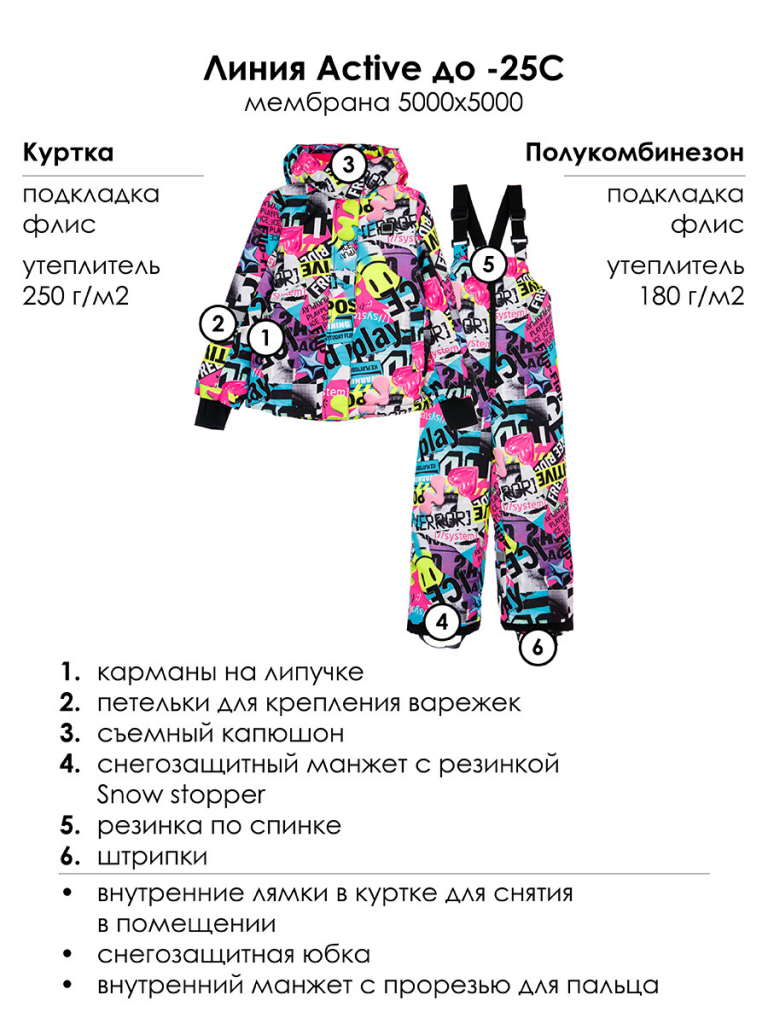 Зимний детский горнолыжный костюм для мальчика. Особенности модели: Линия Active, Температурный режим до -25С, мембрана 5000х5000, Куртка: подкладка - флис,Утеплитель 250 г/м, боковые карманы на липучке,съемный капюшон с адаптацией по ширине резинкой,внешняя ветрозащитная планка на липучках,эргономичные рукава, внутренние лямки для снятия в помещении,снегозащитная юбка с резинкой Snow stopper, Полукомбинезон: Утеплитель 180 г/м подкладка - флис,снегозащитный манжет на брюках с резинкой Snow stopper,резинка по спинке,штрипки, Утепленный горнолыжный комплект - идеальный выбор для активного отдыха на свежем воздухе в зимний период. Инновационный утеплитель и флисовая подкладка сохраняют тепло морозную погоду.Мембранный материал делает этот яркий и модный комбинезон непромокаемым: мембрана не пропускает влагу снаружи, но выводит её изнутри, что крайне важно во время подвижных игр и занятий спортом. Легкий, теплый и удобный, комплект идеально подходит для спорта, лыж, сноуборда и игр на свежем воздухе в холодный период года: зима, поздняя осень и ранняя весна. *Пожалуйста, обратите внимание, что указанный температурный режим является приблизительным и зависит от многих факторов, таких как возраст, физическое состояние, уровень активности ребенка и количество слоев одежды. Время, проведенное на открытом воздухе, и погодные условия, такие как холодный ветер, могут повлиять на тепловые характеристики изделия. Убедитесь, что защищены от холода голова, руки и ноги.