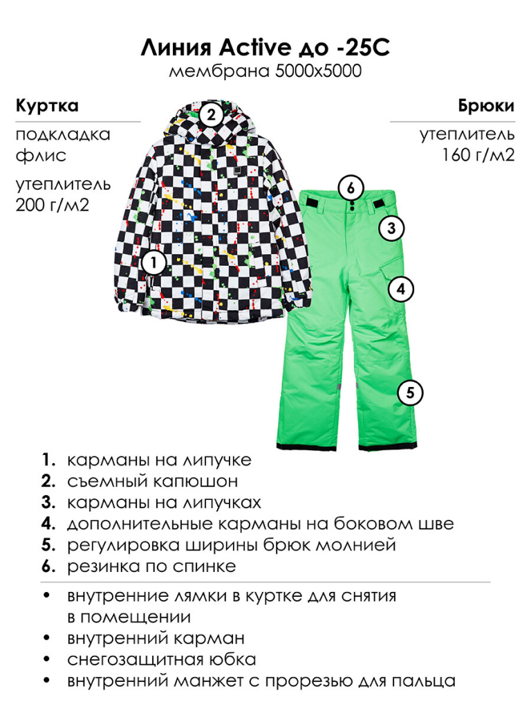 Зимний горнолыжный костюм для мальчика подростка. Особенности модели: Линия Active, Температурный режим до -25С, мембрана 5000х5000, Куртка: подкладка - флис,Утеплитель 200 г/м, боковые карманы на липучке,съемный капюшон с адаптацией по ширине резинкой,внешняя ветрозащитная планка на липучках,эргономичные рукава, внутренние лямки для снятия в помещении,внутренний карман,снегозащитная юбка с резинкой Snow stopper, Брюки:Утеплитель 160 г/м,карманы на липучках,дополнительные карманы на боковом шве,регулировка ширины брюк молнией,Резинка по спинке, Утепленный горнолыжный комплект - идеальный выбор для активного отдыха на свежем воздухе в зимний период. Инновационный утеплитель и флисовая подкладка сохраняют тепло морозную погоду.Мембранный материал делает этот яркий и модный комбинезон непромокаемым: мембрана не пропускает влагу снаружи, но выводит её изнутри, что крайне важно во время подвижных игр и занятий спортом. Легкий, теплый и удобный, комплект идеально подходит для спорта, лыж, сноуборда и игр на свежем воздухе в холодный период года: зима, поздняя осень и ранняя весна. *Пожалуйста, обратите внимание, что указанный температурный режим является приблизительным и зависит от многих факторов, таких как возраст, физическое состояние, уровень активности ребенка и количество слоев одежды. Время, проведенное на открытом воздухе, и погодные условия, такие как холодный ветер, могут повлиять на тепловые характеристики изделия. Убедитесь, что защищены от холода голова, руки и ноги.