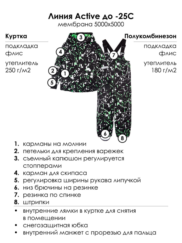 Зимний детский горнолыжный костюм для мальчика. Особенности модели: Линия Active, Температурный режим до -25С, мембрана 5000х5000, Куртка: подкладка - флис,Утеплитель 250 г/м, боковые карманы на молнии,съемный капюшон с утяжкой по ширине резинкой со стопперами,защита подбородка при застегивании молнии,внешняя ветрозащитная планка на липучках,эргономичные рукава,на рукаве карман для скипаса,регулировка ширины рукава липучкой, внутренние лямки для снятия в помещении,снегозащитная юбка с резинкой Snow stopper, Полукомбинезон: Утеплитель 180 г/м подкладка - флис,низ брючины на резинке,резинка по спинке,штрипки, Утепленный горнолыжный комплект - идеальный выбор для активного отдыха на свежем воздухе в зимний период. Инновационный утеплитель и флисовая подкладка сохраняют тепло морозную погоду.Мембранный материал делает этот яркий и модный комбинезон непромокаемым: мембрана не пропускает влагу снаружи, но выводит её изнутри, что крайне важно во время подвижных игр и занятий спортом. Легкий, теплый и удобный, комплект идеально подходит для спорта, лыж, сноуборда и игр на свежем воздухе в холодный период года: зима, поздняя осень и ранняя весна. *Пожалуйста, обратите внимание, что указанный температурный режим является приблизительным и зависит от многих факторов, таких как возраст, физическое состояние, уровень активности ребенка и количество слоев одежды. Время, проведенное на открытом воздухе, и погодные условия, такие как холодный ветер, могут повлиять на тепловые характеристики изделия. Убедитесь, что защищены от холода голова, руки и ноги.