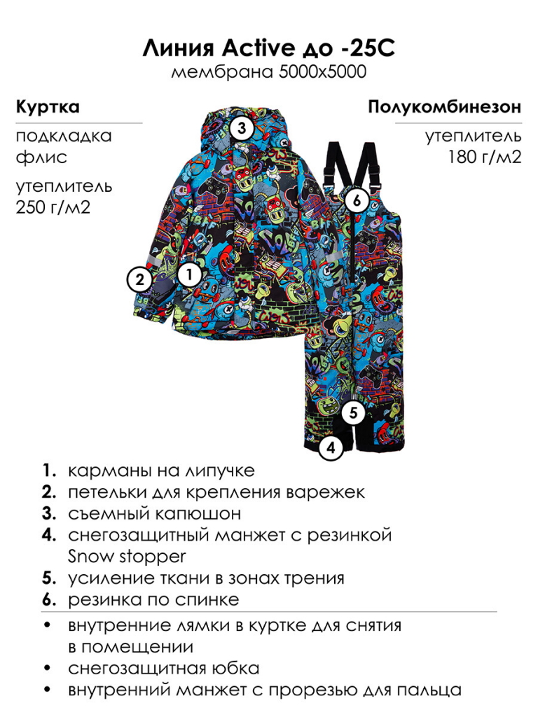 Зимний детский горнолыжный костюм для мальчика. Особенности модели: Линия Active, Температурный режим до -25С, мембрана 5000х5000, Куртка: подкладка - флис,Утеплитель 250 г/м, боковые карманы на липучке,съемный капюшон с адаптацией по ширине резинкой,внешняя ветрозащитная планка на липучках,эргономичные рукава, внутренние лямки для снятия в помещении,снегозащитная юбка с резинкой Snow stopper, Полукомбинезон: Утеплитель 180 г/м подкладка - флис,снегозащитный манжет на брюках с резинкой Snow stopper,усиление по внутреннему шву,резинка по спинке, Утепленный горнолыжный комплект - идеальный выбор для активного отдыха на свежем воздухе в зимний период. Инновационный утеплитель и флисовая подкладка сохраняют тепло морозную погоду.Мембранный материал делает этот яркий и модный комбинезон непромокаемым: мембрана не пропускает влагу снаружи, но выводит её изнутри, что крайне важно во время подвижных игр и занятий спортом. Легкий, теплый и удобный, комплект идеально подходит для спорта, лыж, сноуборда и игр на свежем воздухе в холодный период года: зима, поздняя осень и ранняя весна. *Пожалуйста, обратите внимание, что указанный температурный режим является приблизительным и зависит от многих факторов, таких как возраст, физическое состояние, уровень активности ребенка и количество слоев одежды. Время, проведенное на открытом воздухе, и погодные условия, такие как холодный ветер, могут повлиять на тепловые характеристики изделия. Убедитесь, что защищены от холода голова, руки и ноги.