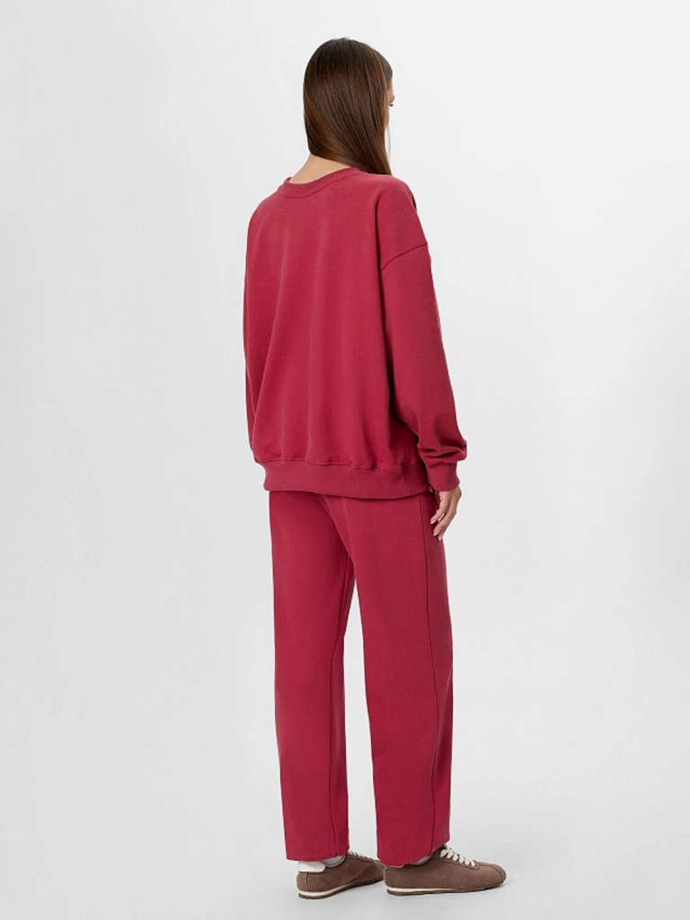 Женский спортивный костюм от Mark Formelle станет удачным вложением в ваш базовый гардероб. Свитшот свободного силуэта с круглой горловиной и длинными рукавами с эластичными манжетами из рибаны обеспечивает свободу движений и уют. А спущенная линия плеча добавляет современный акцент в дизайн. Прямые свободные брюки с эластичным поясом на кулиске гарантируют удобную посадку и практичность, а карманы в боковых швах предоставляют дополнительное удобство. Изделие выполнено из футера с подчесом, что делает костюм теплым и приятным к телу. Этот костюм станет отличным выбором для тех, кто ценит комфорт и стиль в повседневной жизни.
