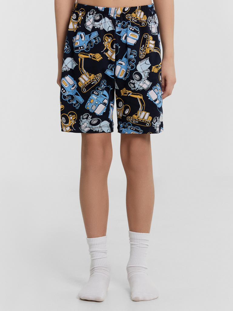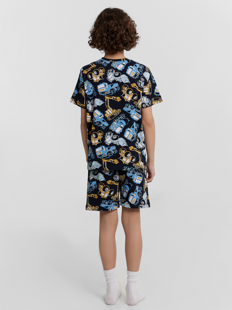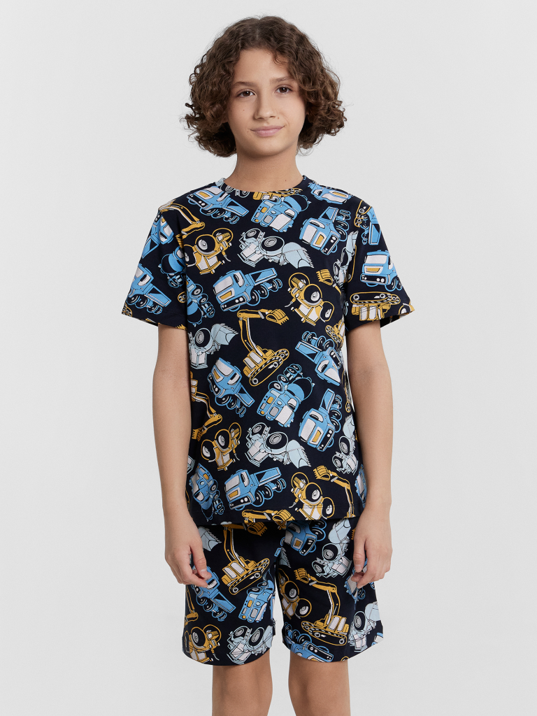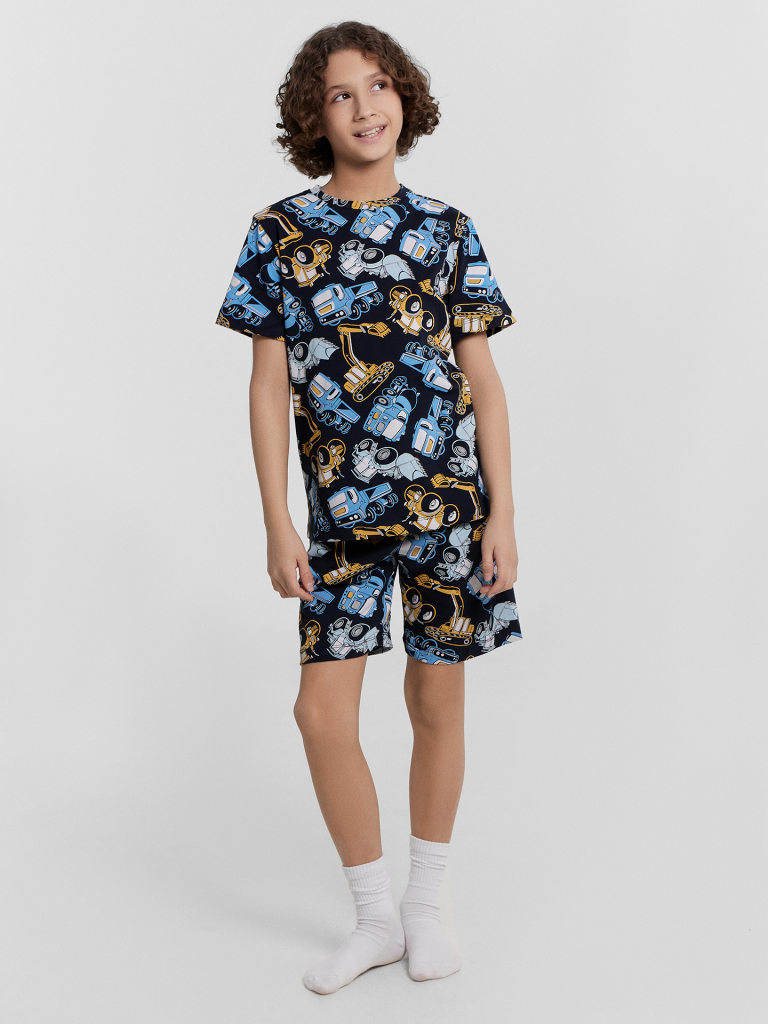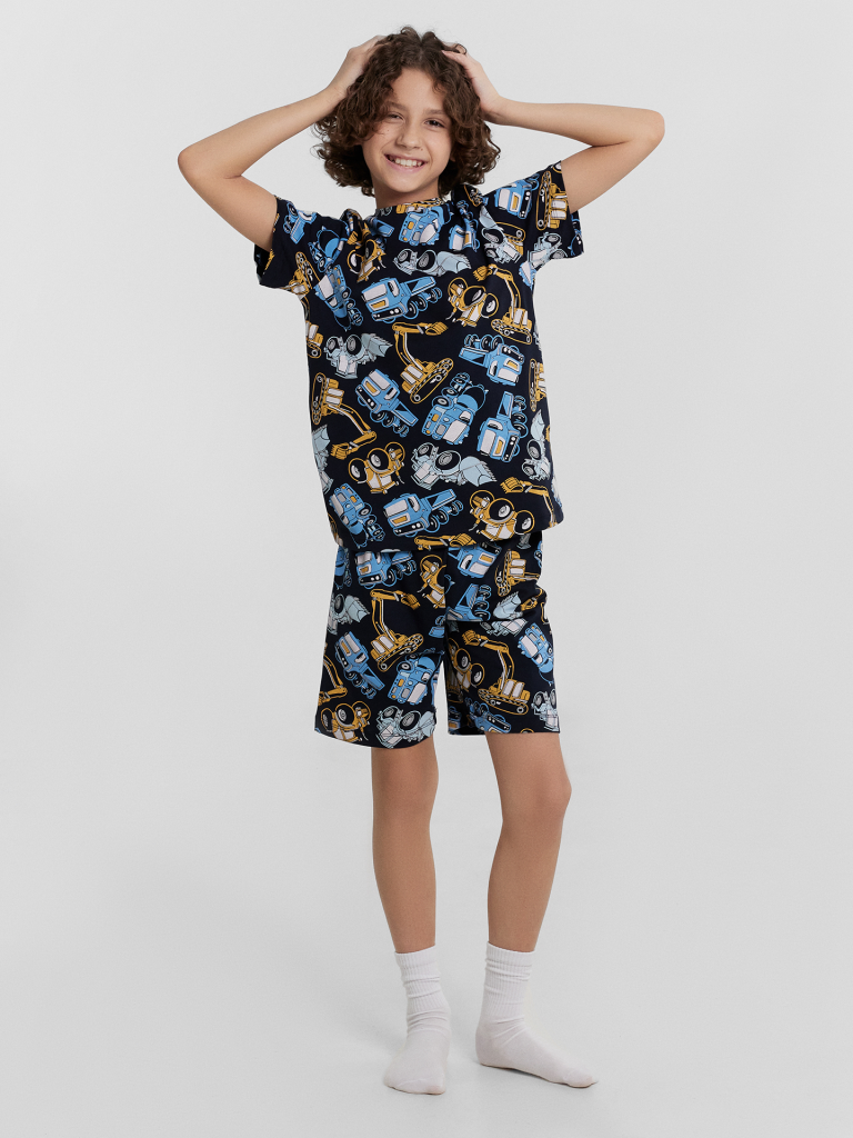 Пижама для мальчиков. Выполнена из хлопкового трикотажа кулирного переплетения. Комплект включает футболку и шорты. Футболка свободная, с круглой горловиной и короткими рукавами. Шорты длиной до колен, с эластичной тесьмой в поясе. Отличный комплект для сна и отдыха!