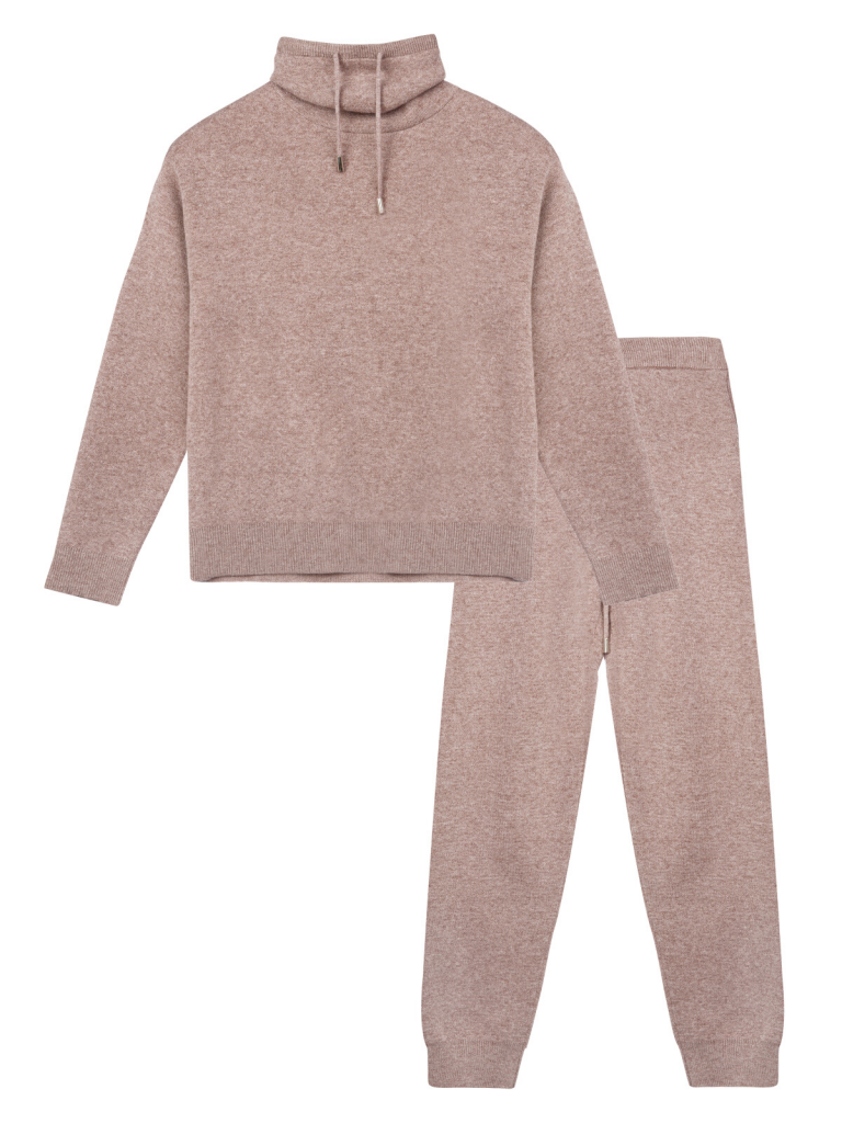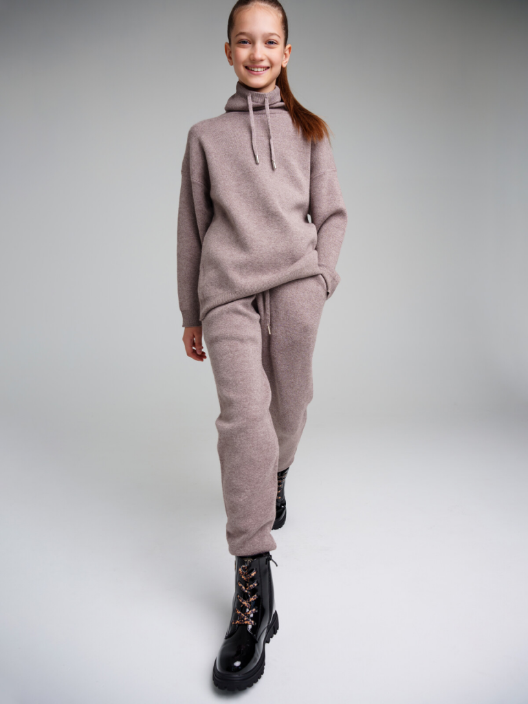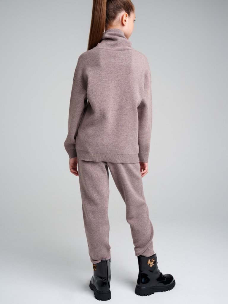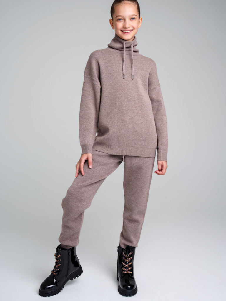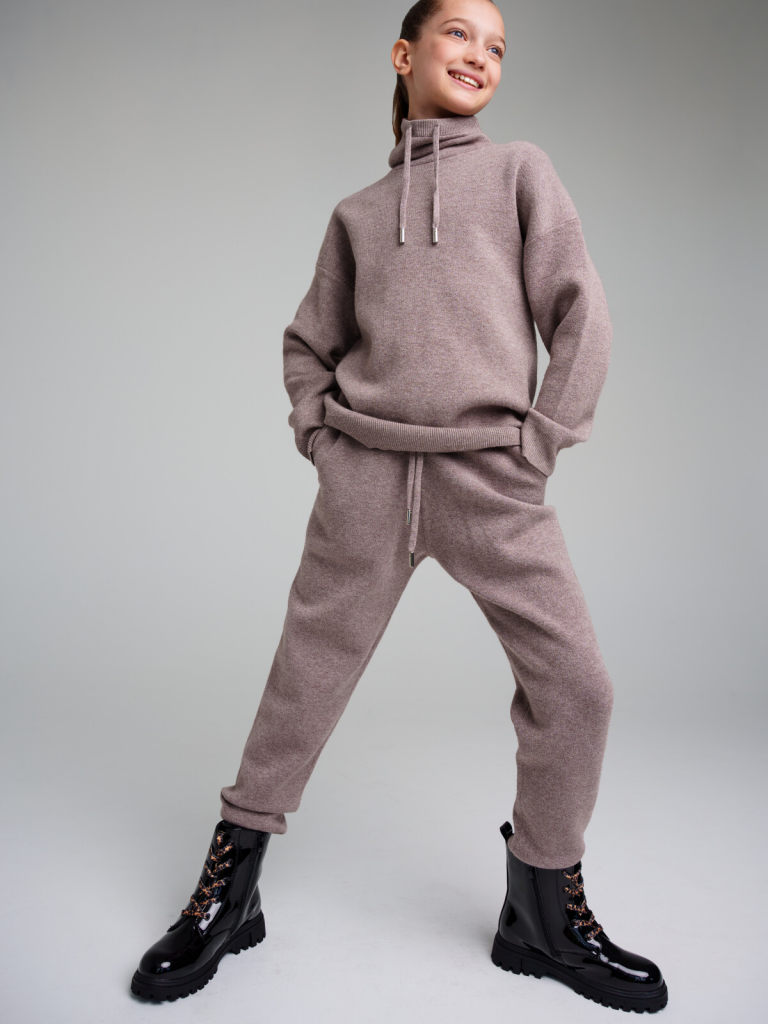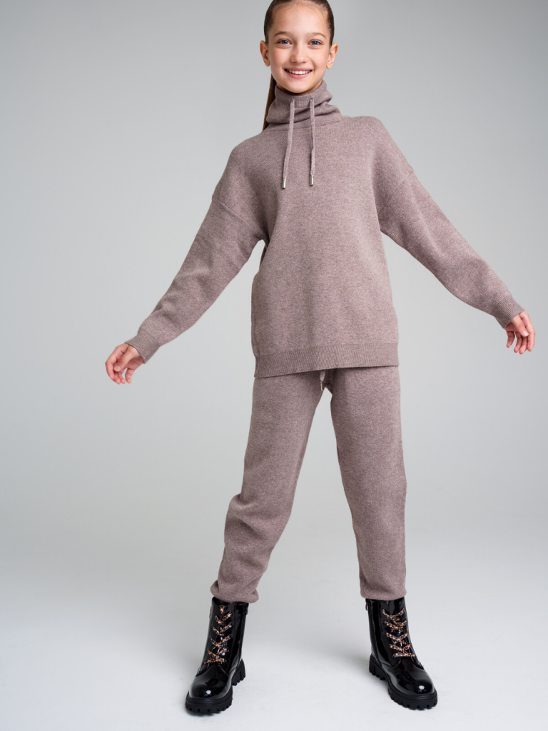 Комплект: джемпер и брюки из вязаного трикотажа. 50% вискоза. Вискоза отличается высокой гигроскопичностью - она впитывает влагу и отлично сохраняет тепло. Горловина, манжеты и низ изделия в рубчик. Брюки с эластичным поясом на шнурке. Карманы в боковых швах.