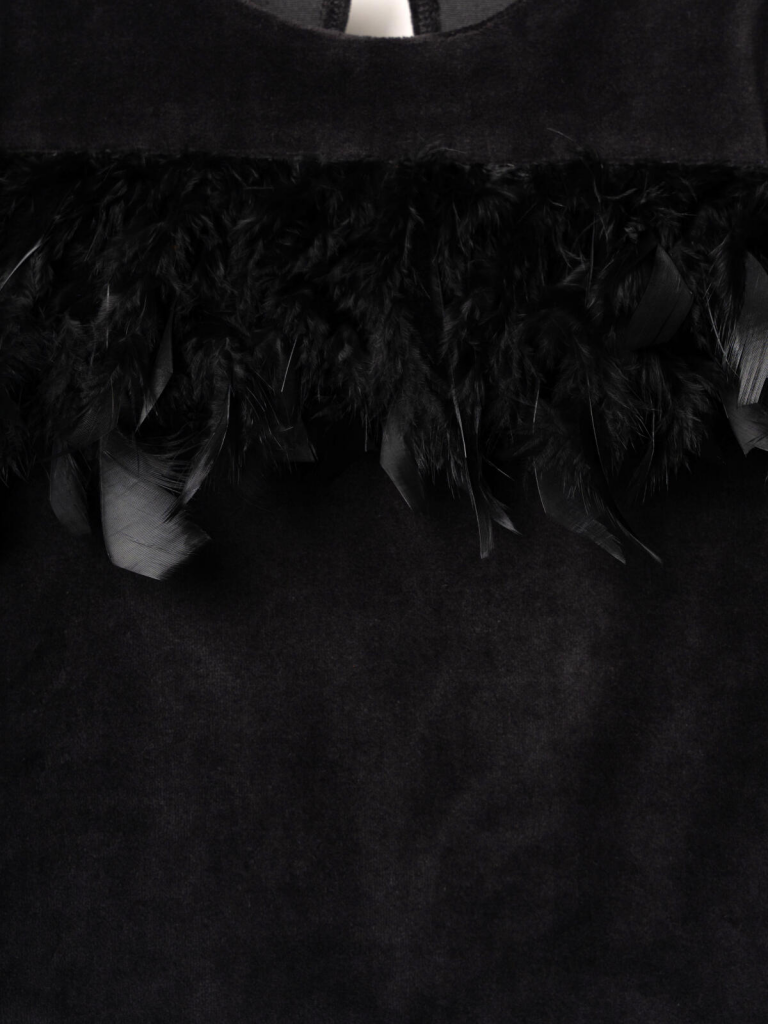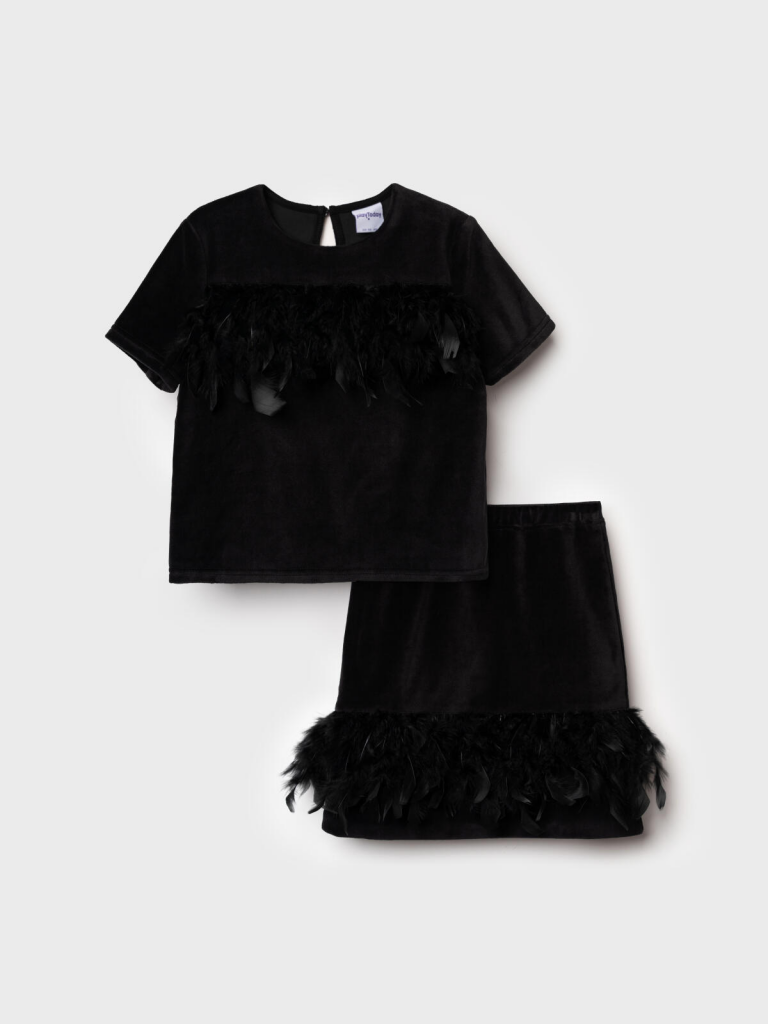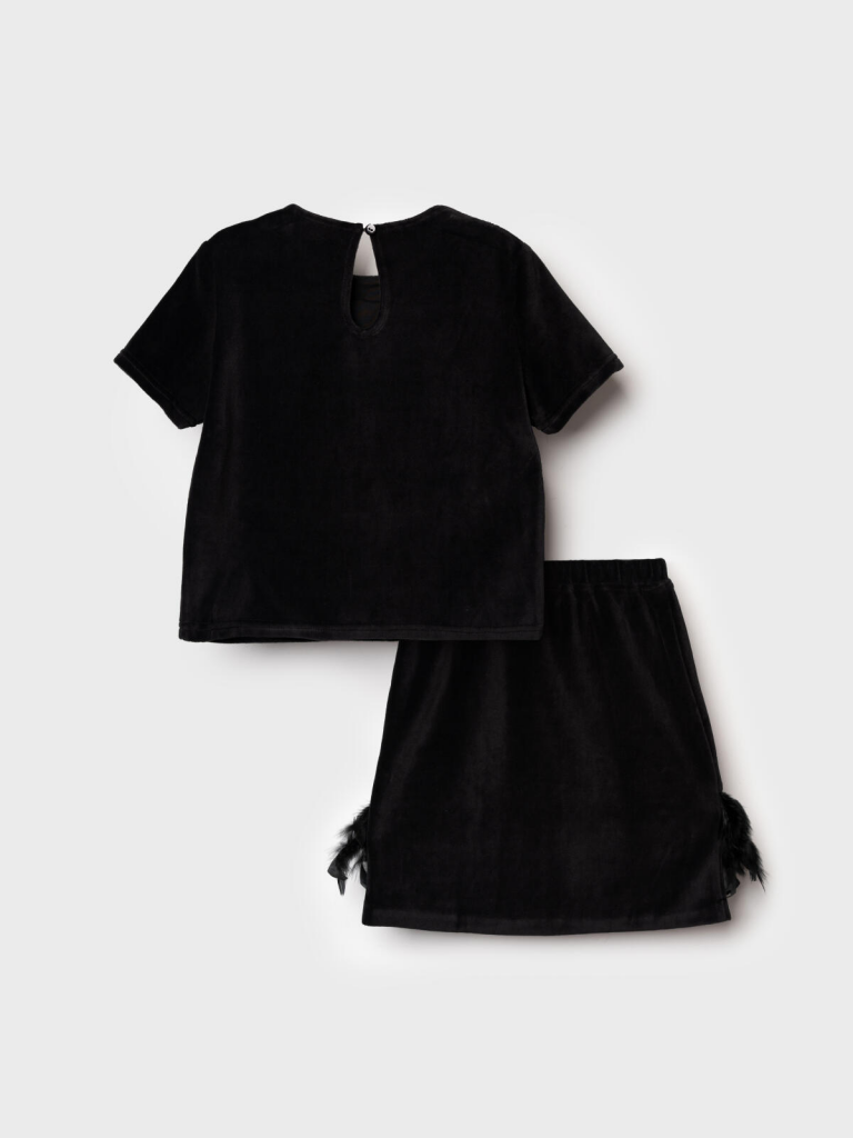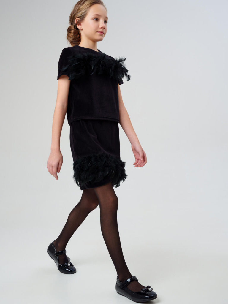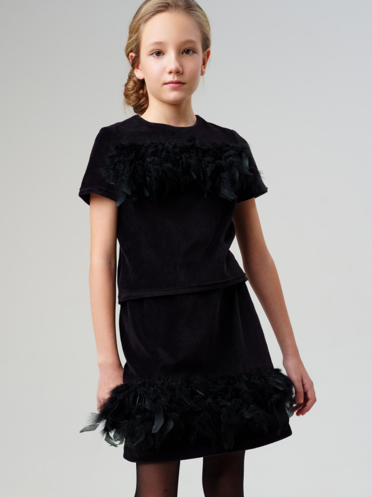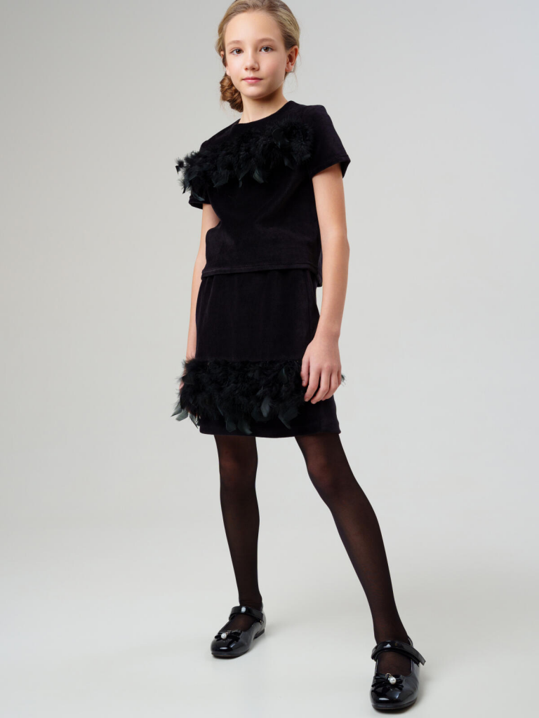 Стильный велюровый костюм для девочки от PlayToday — эффектная и комфортная модель в трендовом исполнении. В набор входят джемпер и юбка из мягкого велюра, украшенные декоративными перьями, которые добавляют образу движения и выразительности.Преимущества модели:+ материал верха — велюр плотностью 250 г/м2, мягкий и приятный к телу+ подкладка из джерси (95% хлопок, 5% эластан) — комфорт и дышащие свойства+ элегантная отделка перьями — модный акцент и лёгкий эффект гламура+ юбка с резинкой по талии — обеспечивает комфортную посадку+ джемпер со спинкой на пуговице — удобно надевать и снимать+ универсальный комплект — можно носить вместе или по отдельностиКогда и как носить:Подходит для праздников, фотосессий, школьных мероприятий и стильных выходов. В повседневных образах юбку можно сочетать с базовыми футболками, а джемпер — с джинсами или брюками.Советы по стилю:Сочетайте с колготками и лаконичными ботинками или туфлями от PlayToday. Добавьте жакет или укороченное пальто, чтобы создать нарядный городской образ.Комплект PlayToday из велюра с перьями — сочетание модного дизайна, комфорта и праздничного блеска для особых случаев.