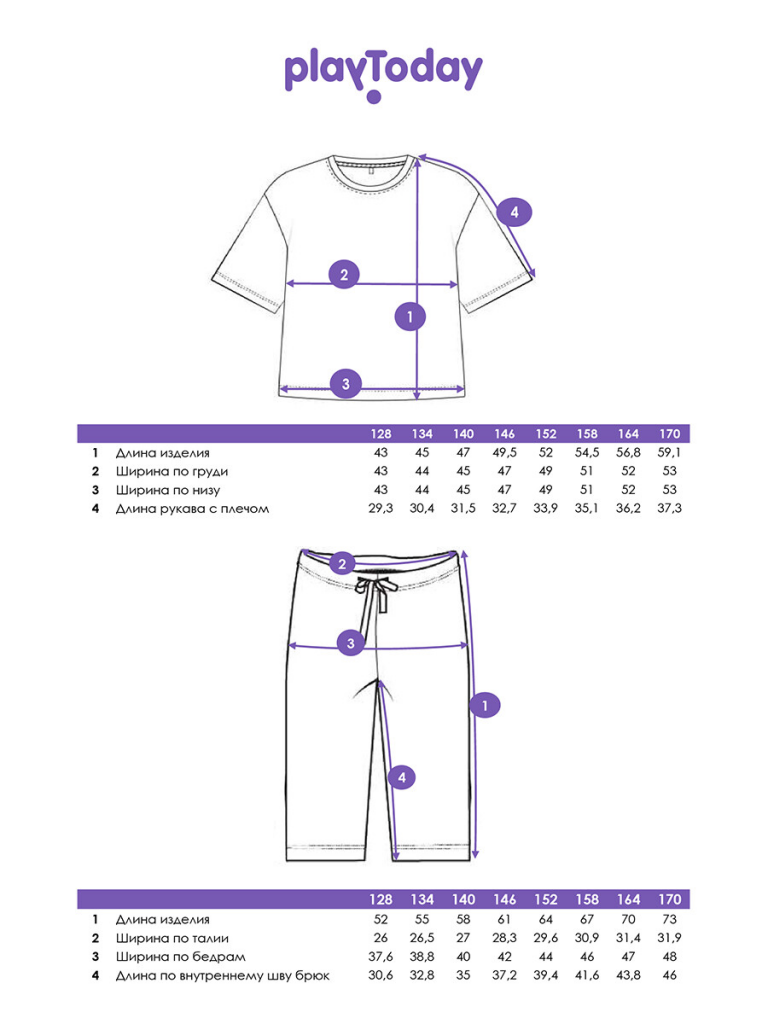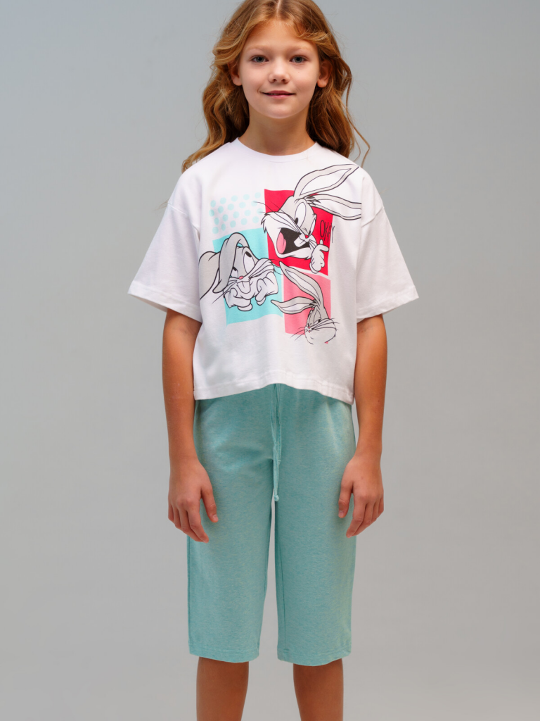 Пижама для девочки подростка. Футболка и капри из эластичного и приятного на ощупь трикотажа. Шорты-капри на резинке со шнурком. Высокое содержание хлопка 95%. Благодаря наличию эластана в составе ткани изделие держит форму и меньше мнется.