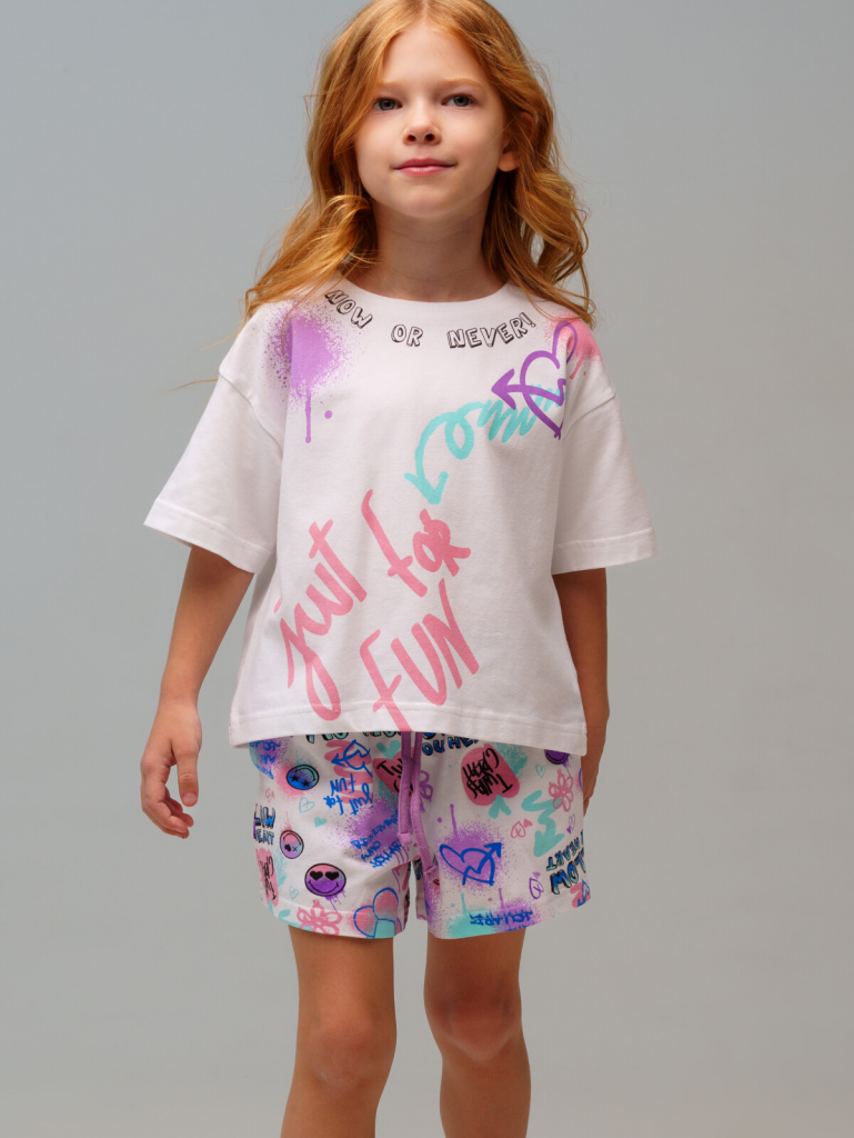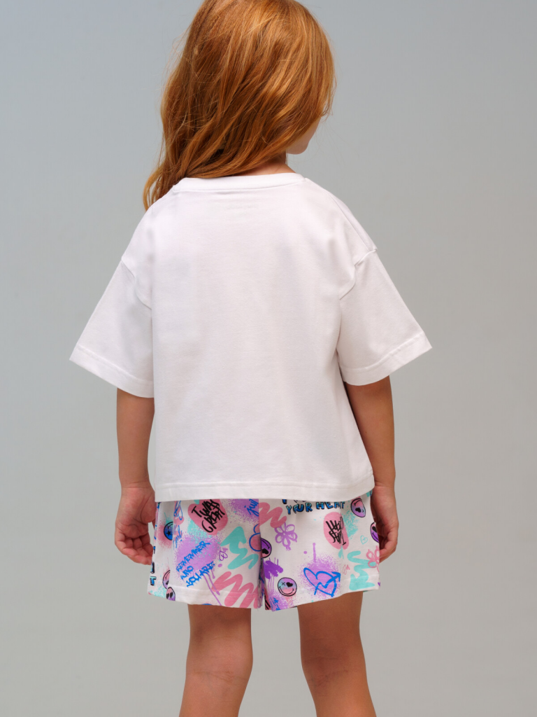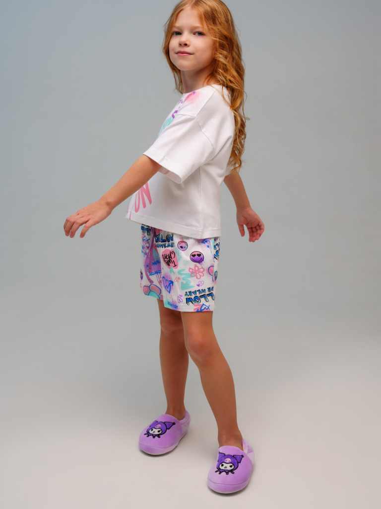 Пижама детская для девочки. Футболка и шорты из эластичного и приятного на ощупь трикотажа. Шорты на резинке. Высокое содержание хлопка 95%. Благодаря наличию эластана в составе ткани изделие держит форму и меньше мнется.