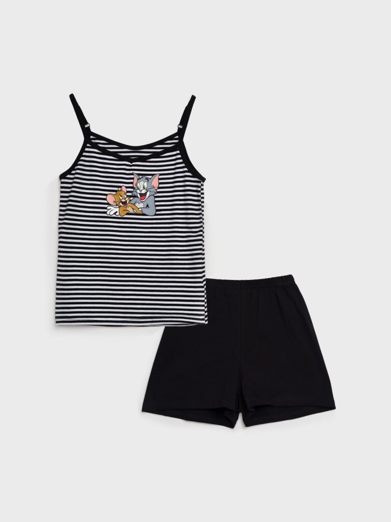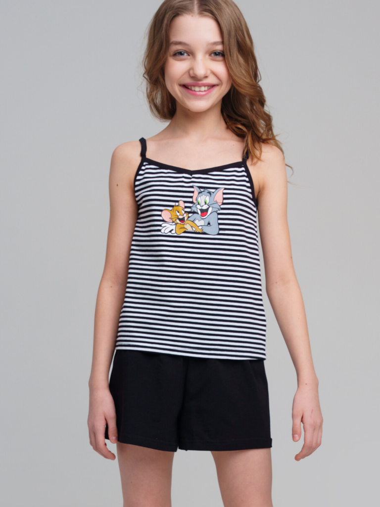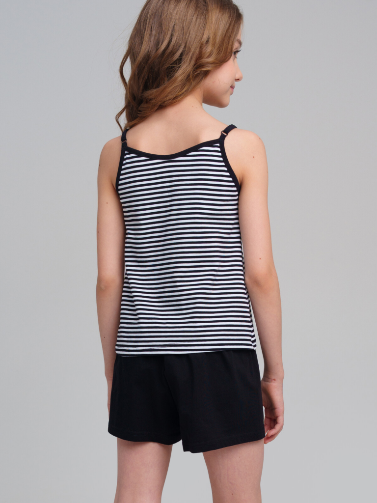 Костюм для девочки подростка. Майка и шорты из эластичного и приятного на ощупь трикотажа. Регулируемые лямки. Шорты на резинке со шнурком. Высокое содержание хлопка 95%. Благодаря наличию эластана в составе ткани изделие держит форму и меньше мнется.
