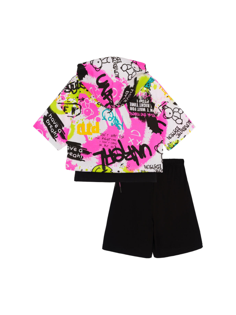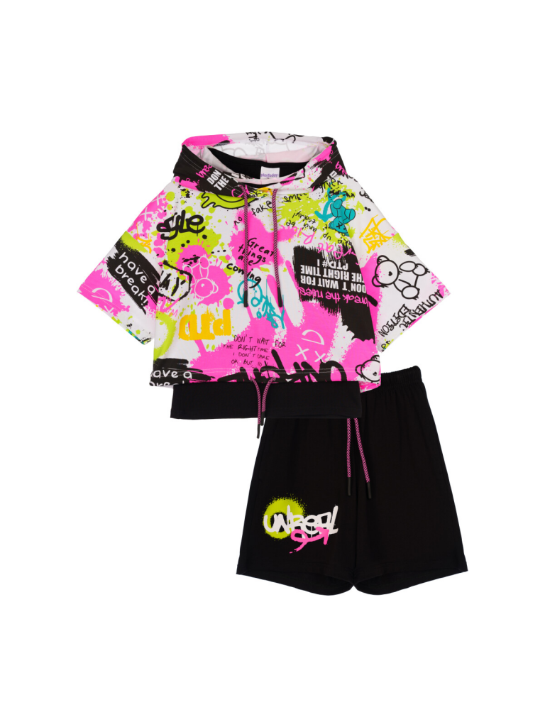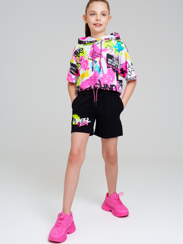 Костюм для девочки подростка. Майка, шорты, футболка из эластичного и приятного на ощупь трикотажа джерси. Капюшон и низ футболки с утяжкой шнурком. Шорты на резинке со шнурком. Функциональные боковые карманы. Высокое содержание хлопка 95%. Благодаря наличию эластана в составе ткани изделие держит форму и меньше мнется. Модель выполнена из качественного и приятного на ощупь трикотажа.
