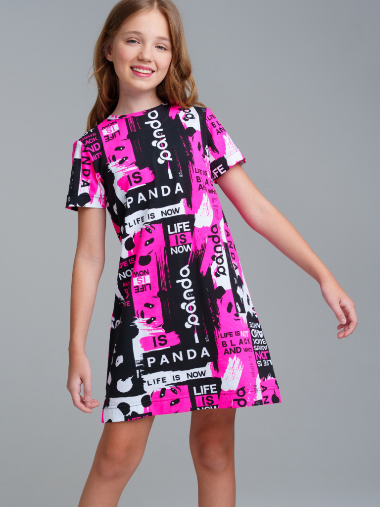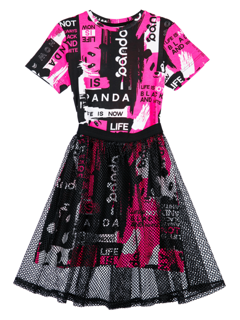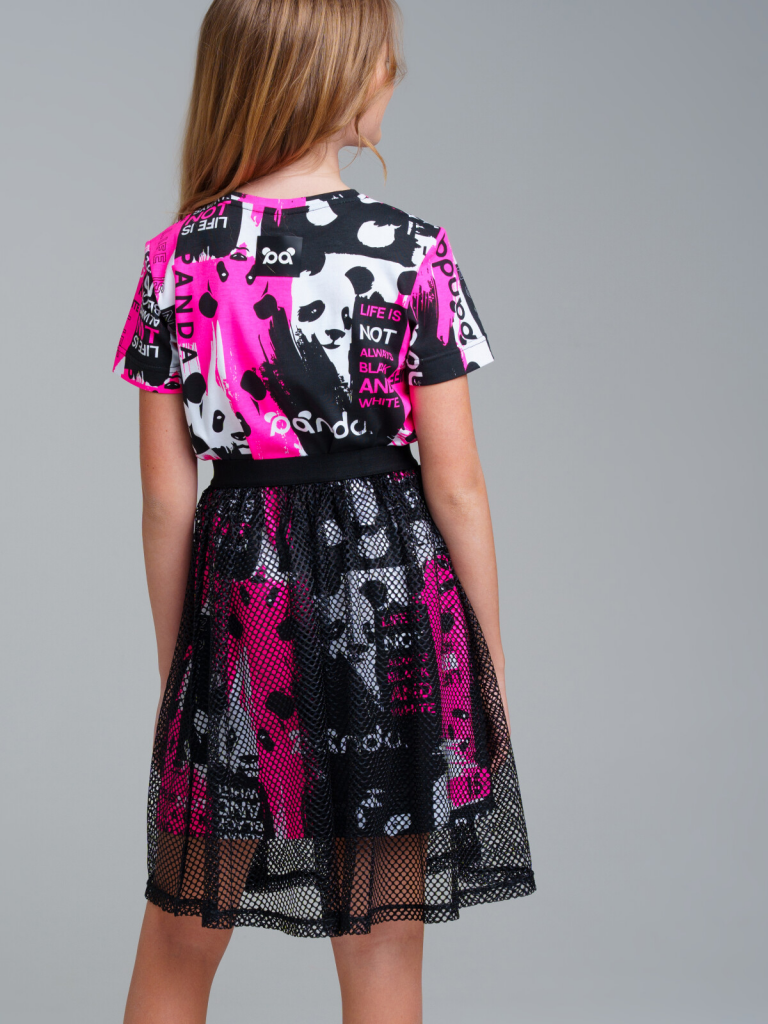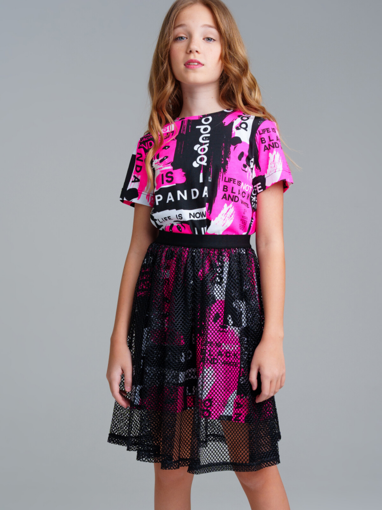 Oversize платье из качественного и приятного на ощупь трикотажа джерси. Высокое содержание хлопка 95%. Благодаря наличию эластана в составе ткани изделие проще в уходе и держит форму. Юбка из сетки с ластичным поясом по талии.