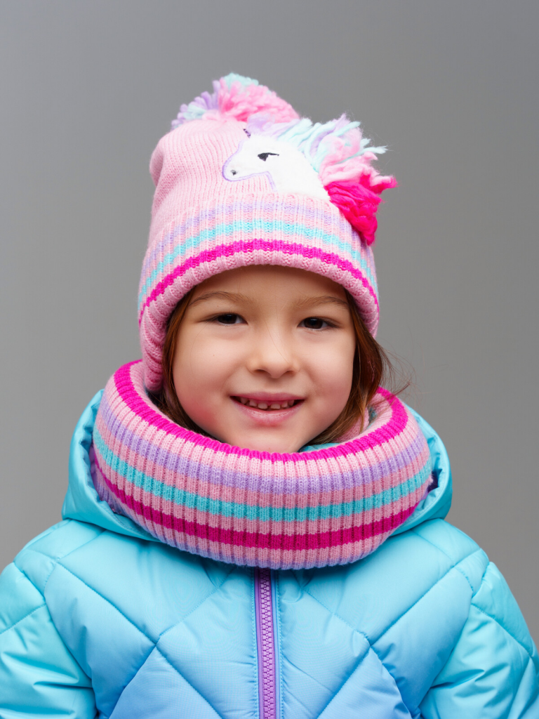 Комплект детский для девочки. Модная шапка и снуд из акрила отлично подойдут на холодное время года ( осень, зима). Модель из капсульной коллекции UNICORN KUROMI (ЮНИКОРН КОРОМИ). Соберите полный образ в едином стиле!