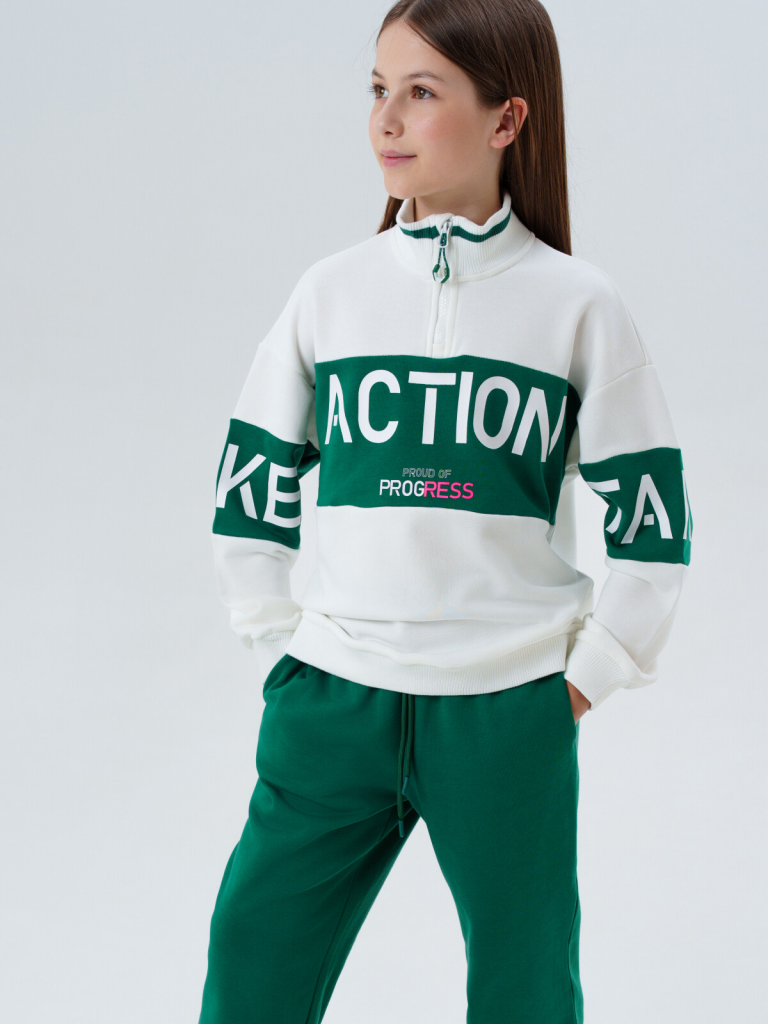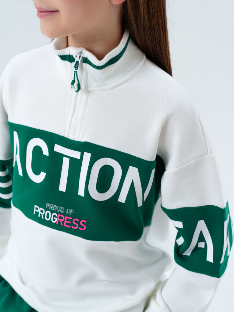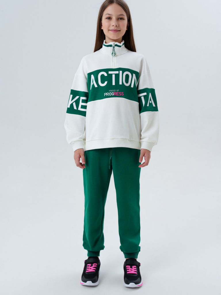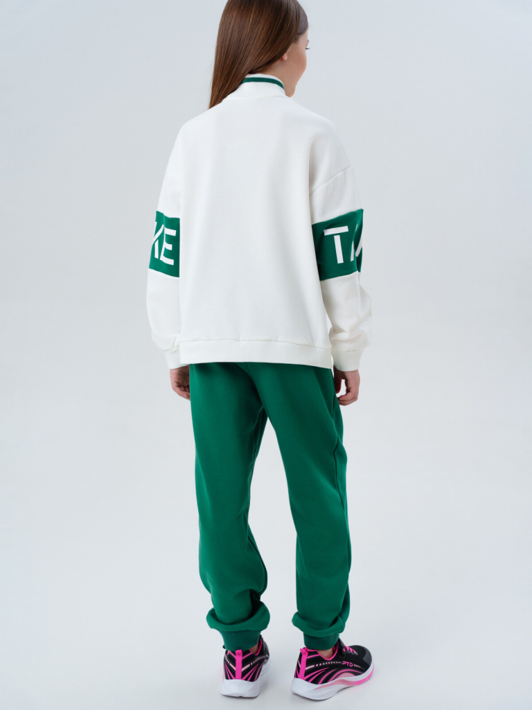 > Комплект трикотажный для девочек: толстовка, брюки темно-зеленый,молочный