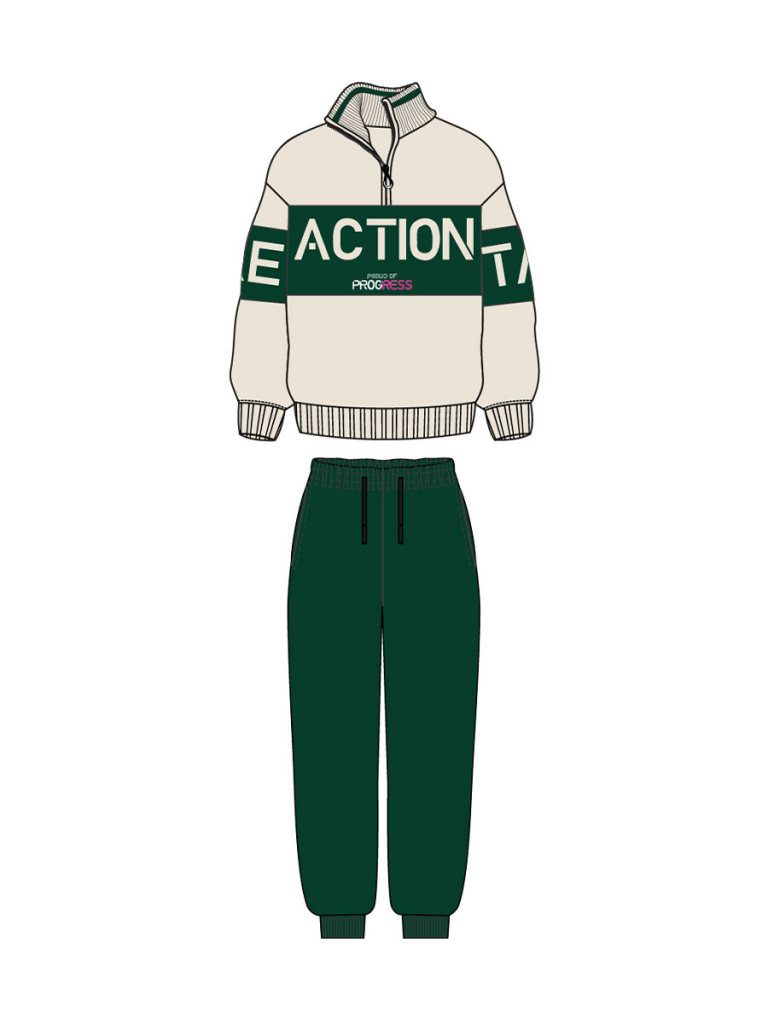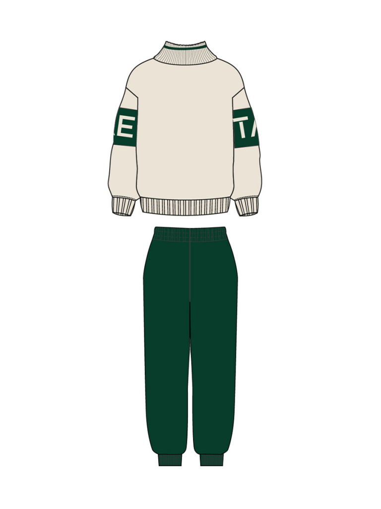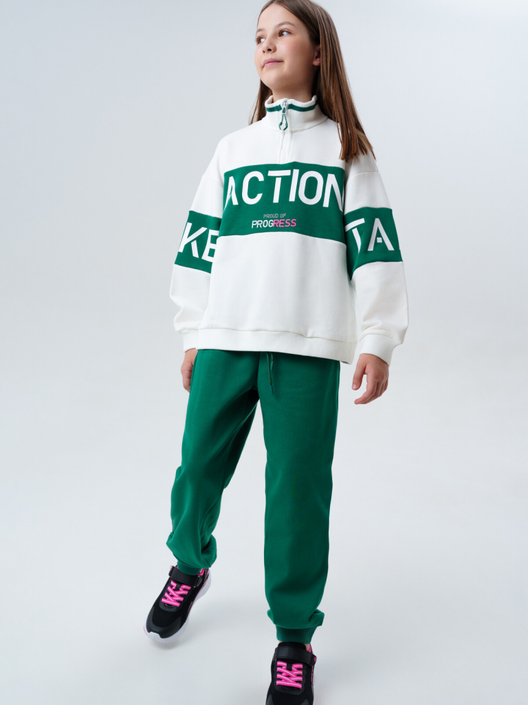 Комплект трикотажный для девочек: толстовка, брюки темно-зеленый,молочный