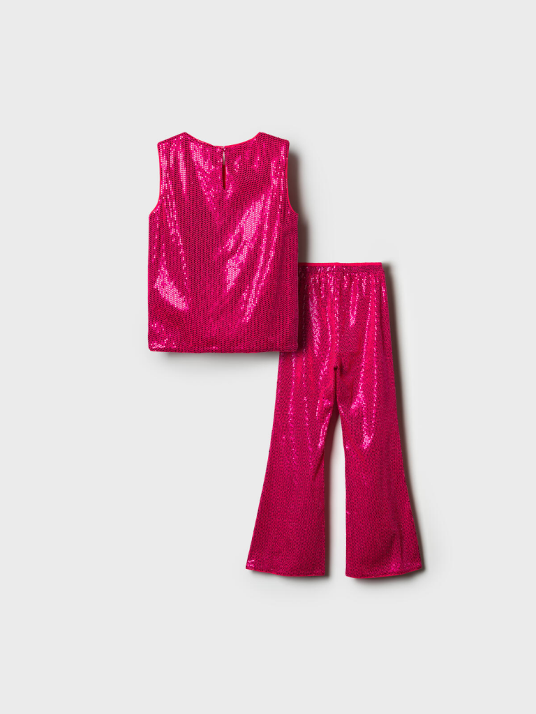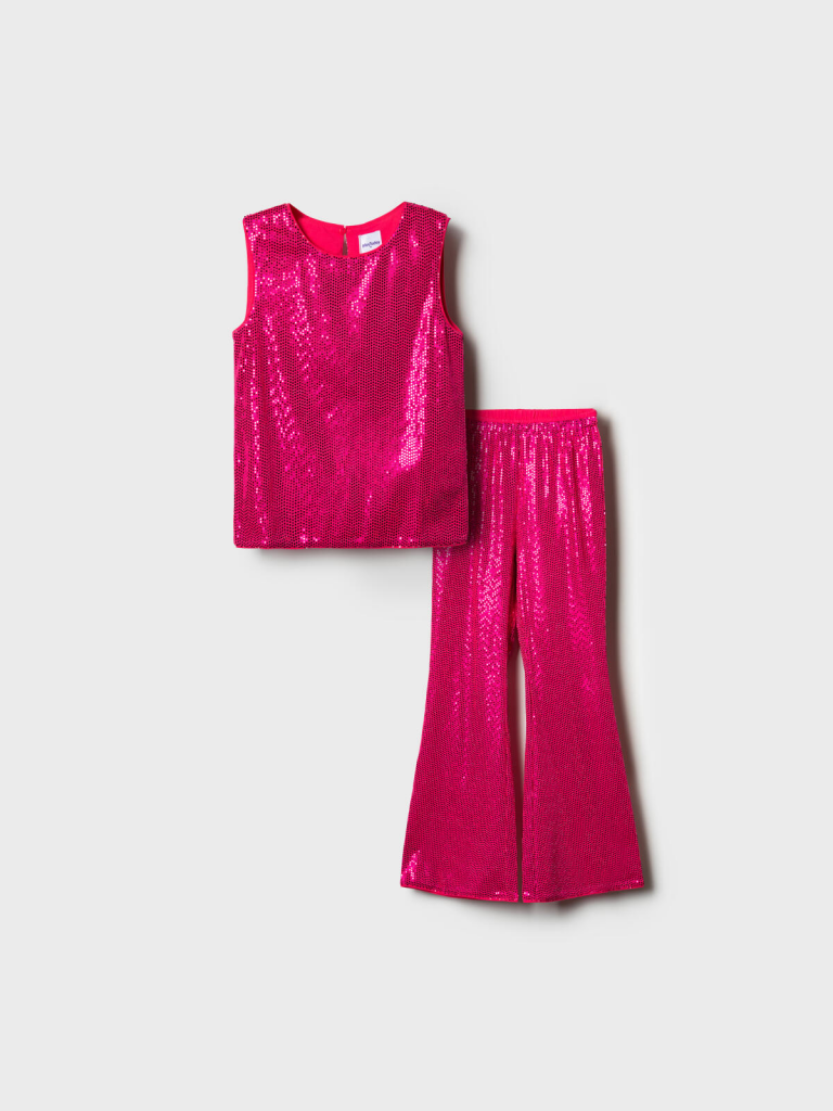 Яркий нарядный костюм для девочки от PlayToday — эффектный наряд для праздников и стильных выходов. В набор входят топ без рукавов и расклёшенные легинсы, выполненные из ткани с паетками. Мягкий материал с эластаном тянется и не сковывает движения, а подкладка из хлопка делает изделие комфортным при носке.Преимущества модели:+ ткань с паетками— создаёт праздничное настроение и сияние в движении+ эластичный материал — идеально садится по фигуре, не сковывает движений+ мягкая подкладка с хлопком — комфорт и приятные ощущения к телу+ топ без рукавов с застёжкой на спинке — удобно надевать и снимать+ брюки-клёш — модный силуэт, визуально вытягивающий фигуру+ универсальный праздничный комплект — можно носить вместе или отдельноКогда и как носить:Идеален для праздников, дней рождения, концертов, нового года, танцевальных выступлений, фотосессий и стильных прогулок.Советы по стилю:Сочетайте с короткой курткой, кардиганом или жакетом от PlayToday. В прохладную погоду добавьте лонгслив под топ. В качестве обуви подойдут балетки, ботинки или кроссовки на платформе.Яркий подростковый костюм для девочек PlayToday — идеальное сочетание комфорта, моды и блеска для девочек, которые любят быть в центре внимания. Подходит для девочек подростков и школьниц от 8 лет.
