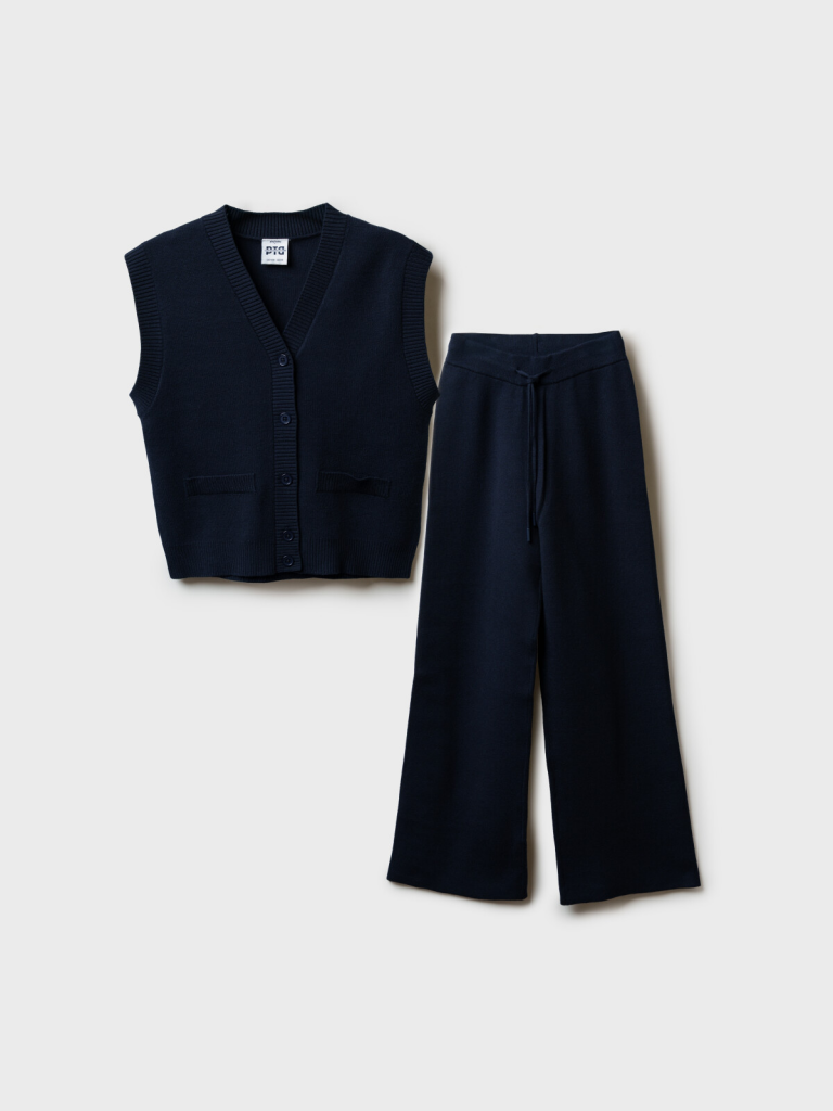 Трикотажный костюм темно-синего цвета - стиль и комфорт для девочки подростка. Этот элегантный костюм в темно-синем цвете отлично подойдет для школьницы и станет универсальным вариантом в школу или для повседневной носки.Ключевые особенности:+ Жилет на пуговицах - удобная застежка, классический крой, аккуратный внешний вид+ Брюки на резинке - регулируемая посадка по талии для максимального комфорта+ Боковые карманы+ Качественный трикотаж - приятный к телу, сохраняет форму после стирки+ Универсальный цвет - легко комбинируется с рубашками, водолазками и футболкамиПочему стоит выбрать этот комплект?Удобный и практичный - идеален для повседневной носки и школьных буднейСтильный дизайн - подчеркивает аккуратность и опрятностьКомфортная посадка - не сковывает движения, подходит для активного дняИдеальный комплект для школьницы - сочетание элегантности и удобства. Подарите своей девочке стильный и практичный набор, который подойдет для учебы, прогулок и особых случаев.