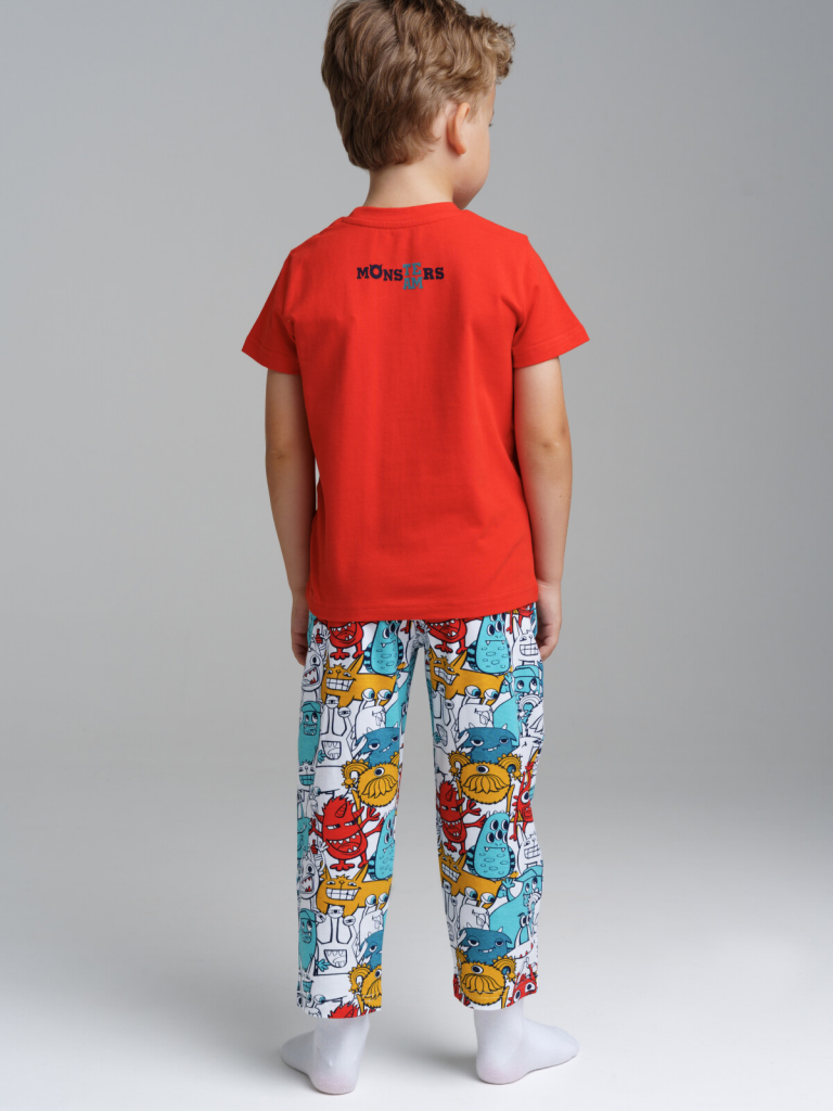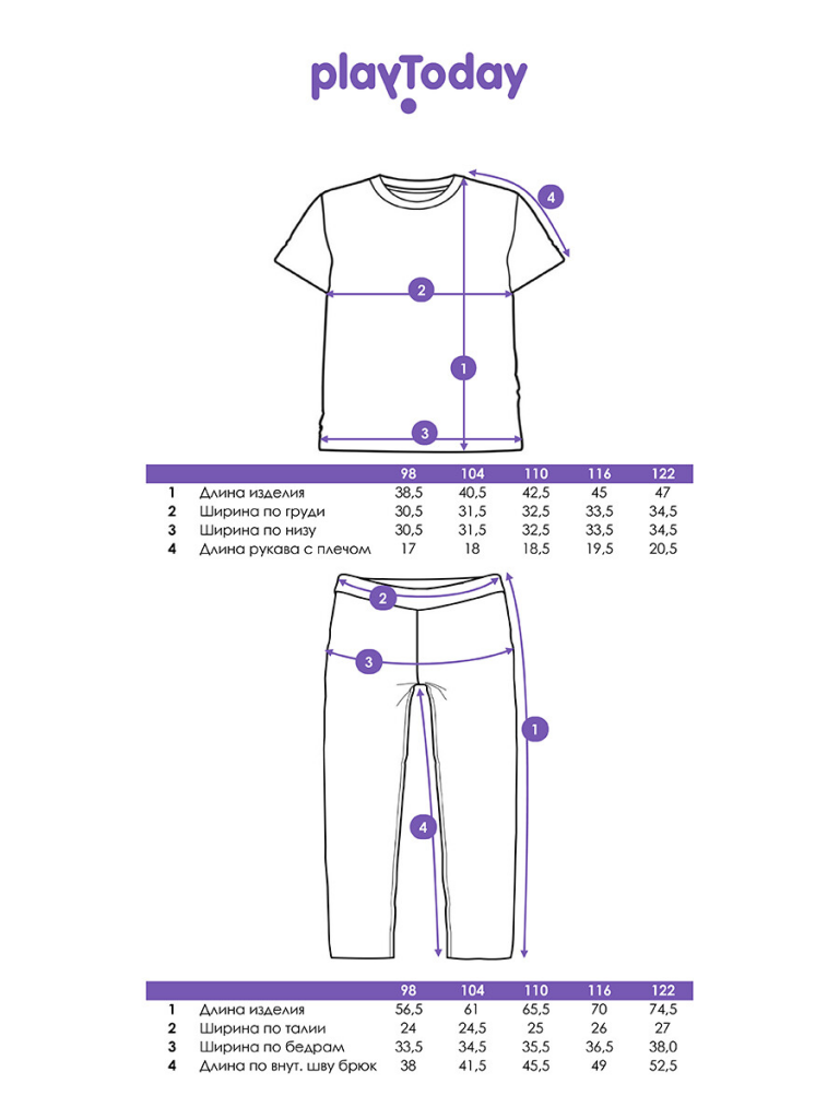 Пижама: футболка и брюки из эластичного и приятного на ощупь трикотажа. На брюках эластичный пояс со шнурком. Высокое содержание хлопка 95%. Благодаря наличию эластана в составе ткани изделие держит форму и меньше мнется.