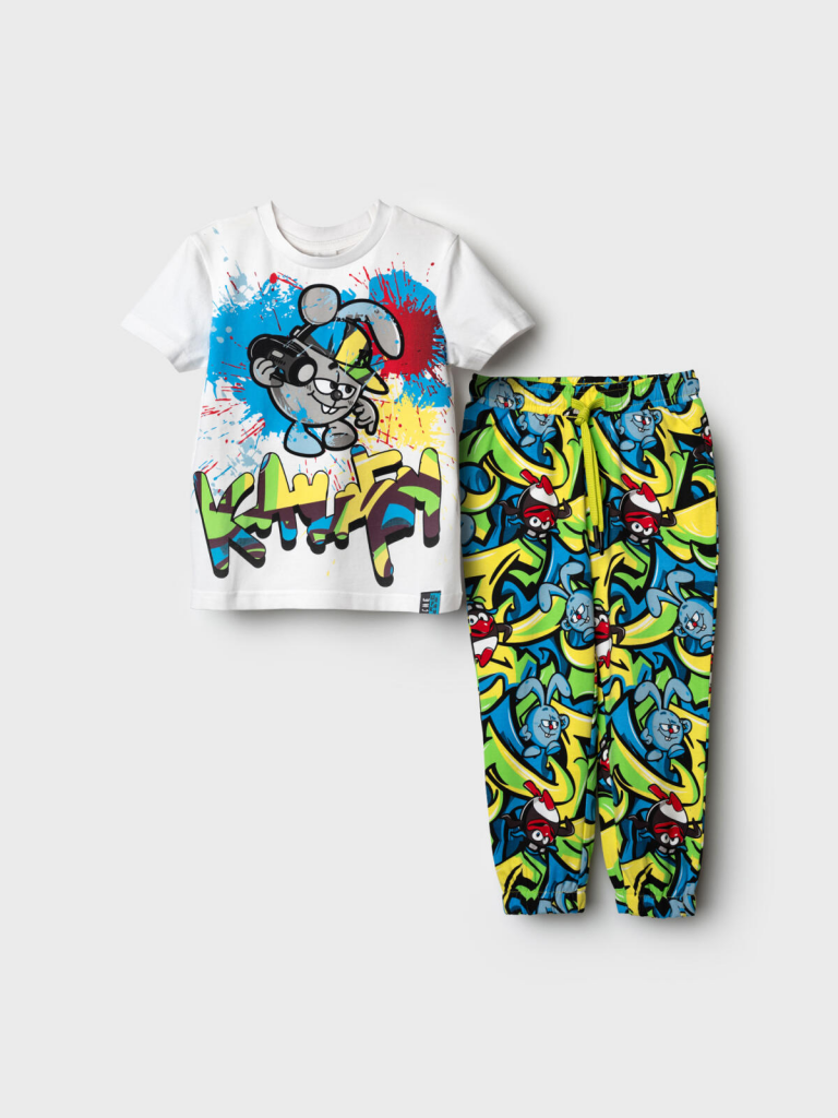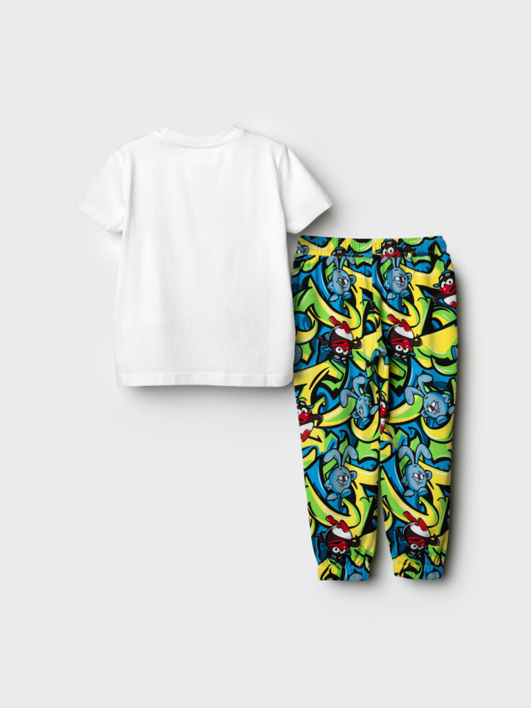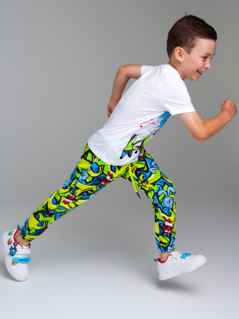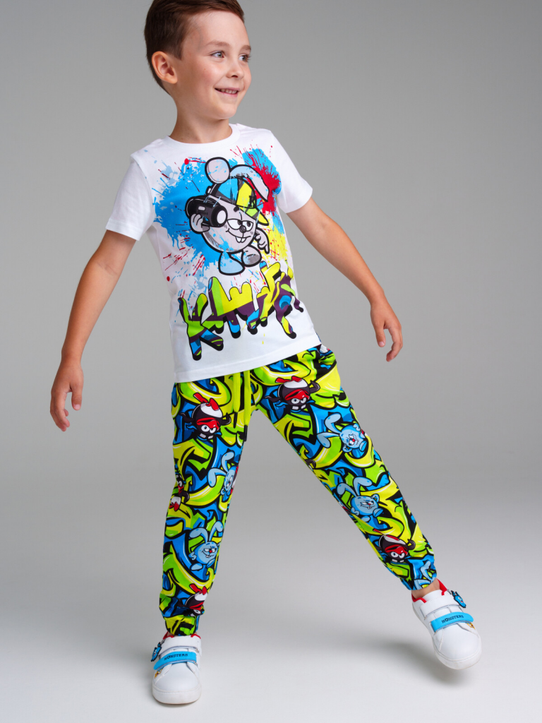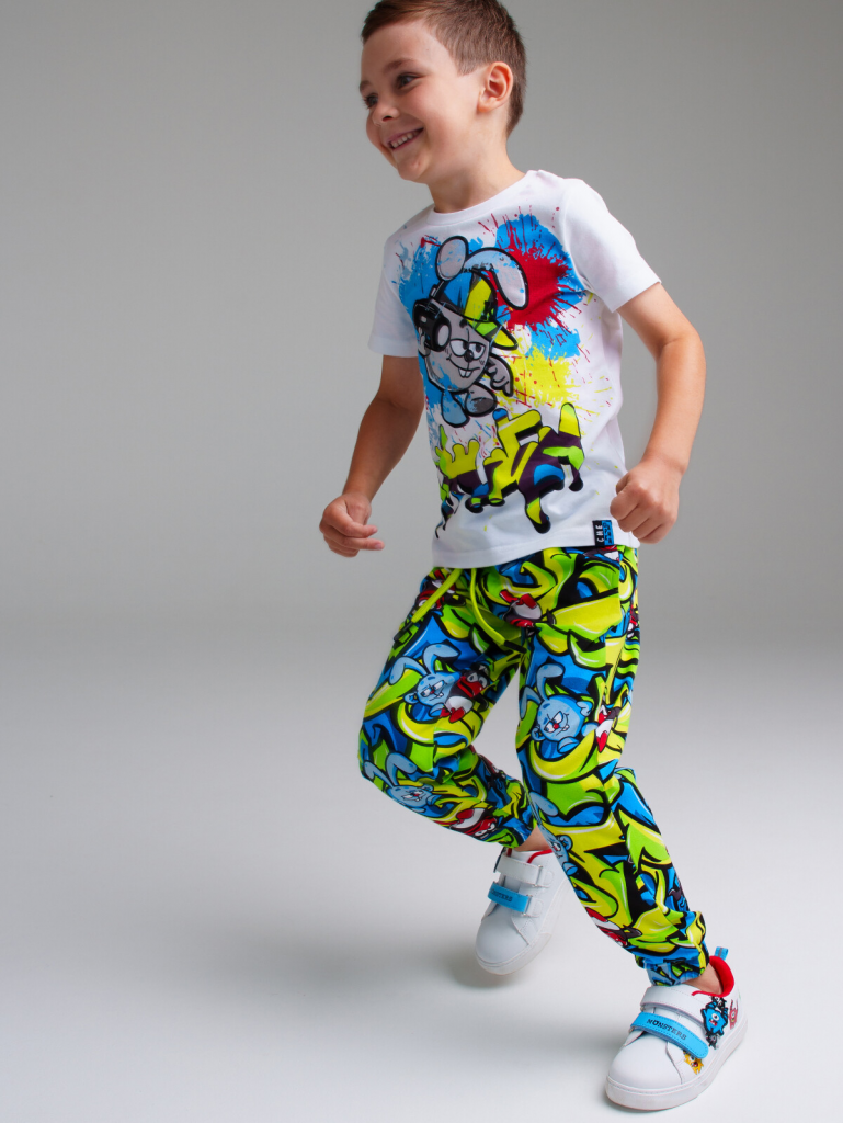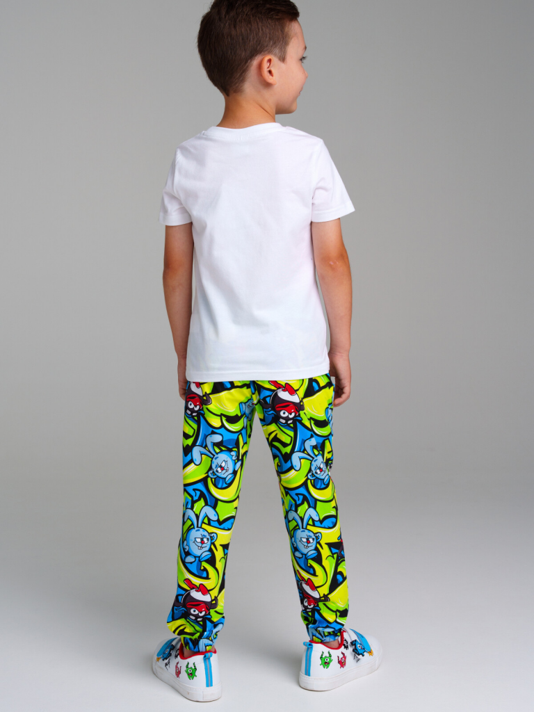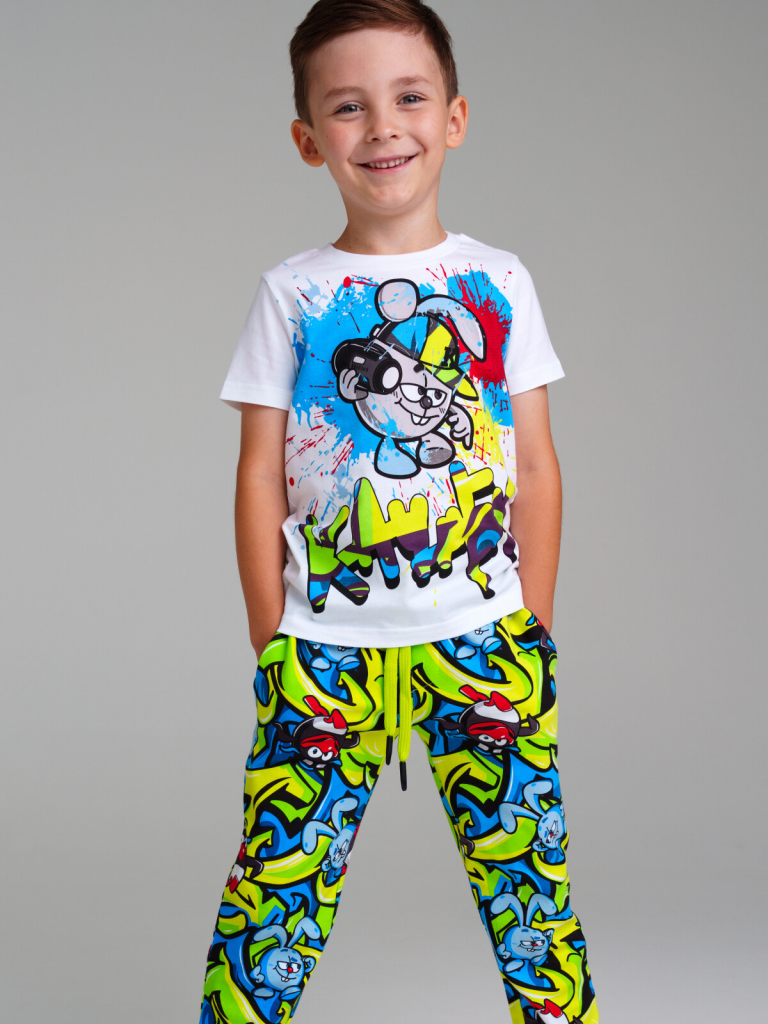 Комплект Смешарики: футболка и брюки. Выполнен из эластичного и приятного на ощупь трикотажа. Брюки с карманами в боковых швах. Эластичный пояс со шнурком. Эластичные манжеты по низу брючин. Высокое содержание хлопка 95%. Благодаря наличию эластана в составе ткани изделие держит форму и меньше мнется.