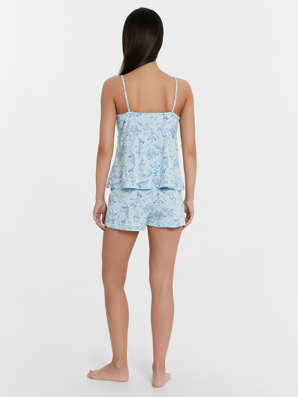 Элегантный пижамный комплект для крепких снов и домашних дел. В составе полотна – только натуральный хлопок. В комплект входят свободные мини-шорты и очаровательный топ расширяющегося силуэта на тонких бретелях с V-образным вырезом. Вам идет эта пижама!