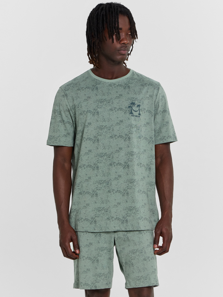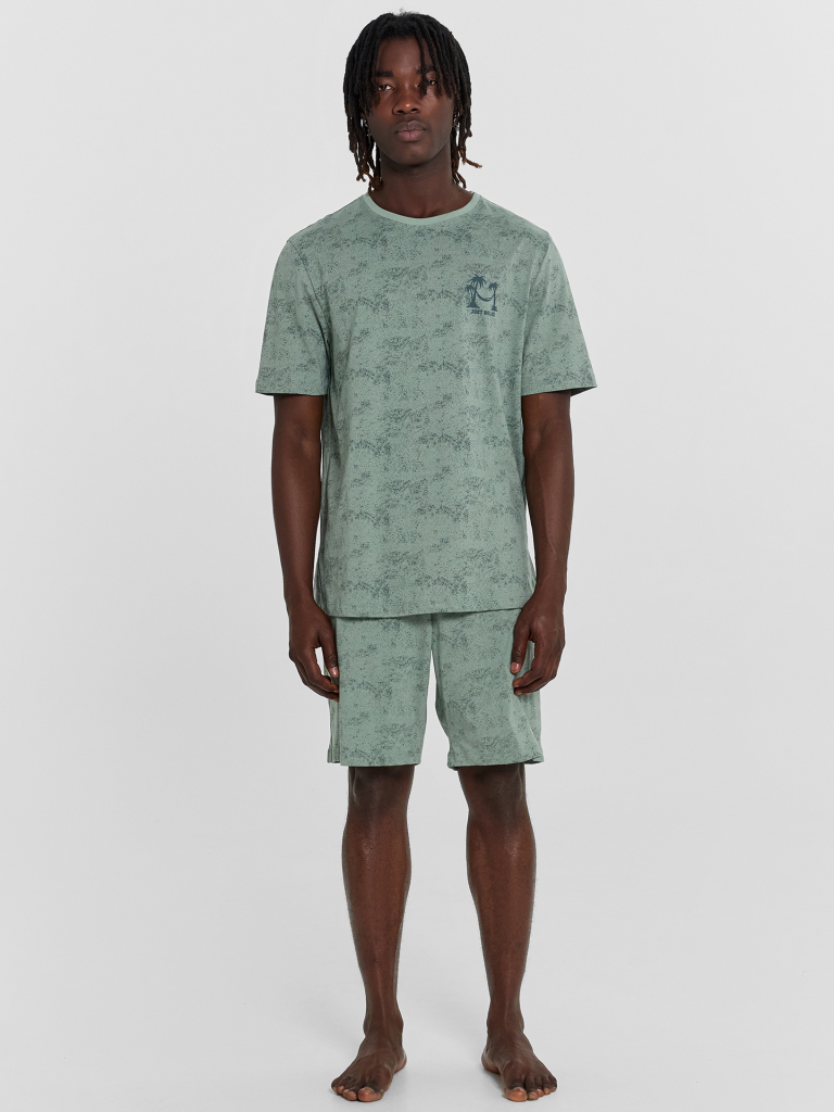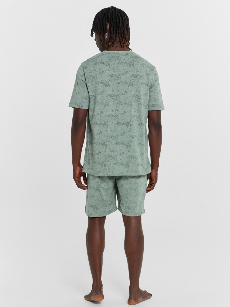 Пижама состоит из футболки и шорт. Футболка прямого силуэта. Горловина округлой формы обработана обтачкой из рибаны. Шов втачивания обтачки по спинке закрыт бейкой из основного полотна. Нижние срезы футболки и рукавов обработаны швом вподгибку.