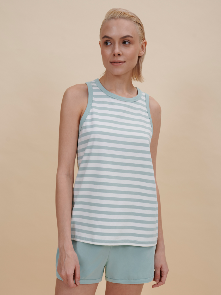 Домашний комплект женский с шортами и майкой – комфортная повседневная одежда для дома. Домашняя одежда всегда должна быть изысканной, создавать чувство уверенности и красоты. Майка свободного кроя дарит комфорт и свободу движений. Проймы "а-ля американка" – один из актуальных летних трендов. Удобная майка в полоску – стильная деталь женского гардероба. Модель лаконичного дизайна, без принта. В составе ткани изделия преобладает высококачественный хлопок – пижама мягкая и отлично пропускает воздух, давая коже дышать. Эластан помогает модели сохранять первоначальную форму. Шорты свободного кроя, средней длины – для удобства и комфорта. Шортики женские на широкой эластичной резинке – она не давит и не перекручивается. В линейке представлены следующие размеры: XS (42), S (44), M (46), L (48), XL (50). Женский пижамный костюм в спортивном стиле подходит как женщинам, так и девушкам, девочкам-подросткам. Модель представлена в следующих цветах: синем, зелёном, бежевом. Домашний женский комплект идеален для комфортного сна, пижамной вечеринки. Топ свободного кроя подходит для повседневного летнего гардероба, прогулок, отдыха. А также пижама хлопковая женская удобна для беременных и кормящих. Комплект женский домашний из майки и шорт – чудесный подарок для мамы, сестры или подруги на любой праздник. Выбирайте нужный размер по таблице размеров на фото. Цвет товара на экране вашего устройства может отличаться от цвета изделия вживую.
