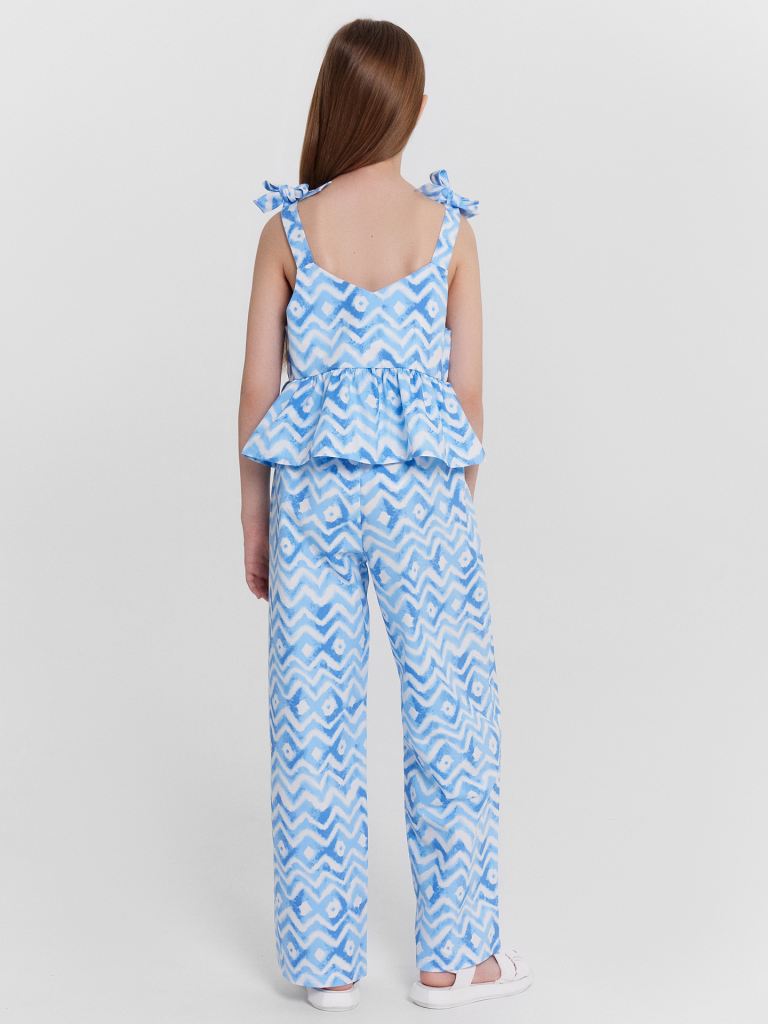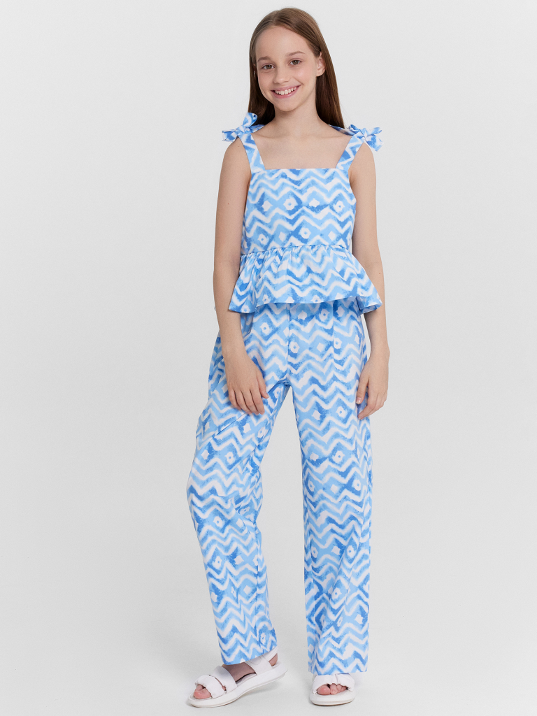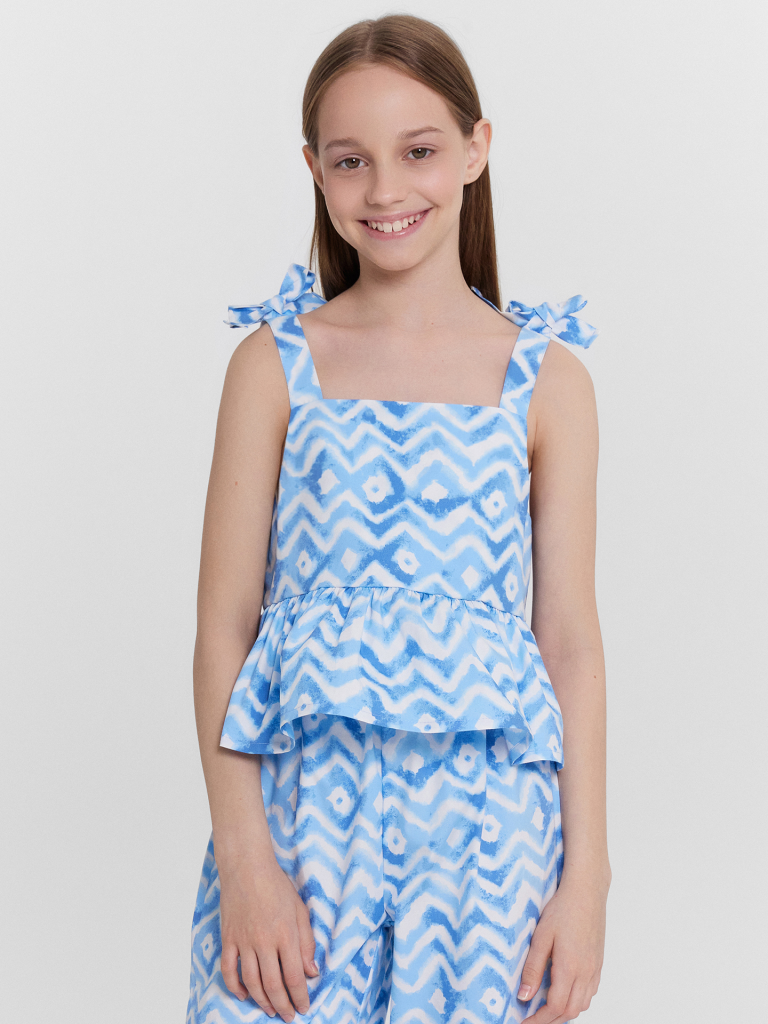 Блуза для девочек на бретелях, полуприлегающего силуэта. Бретели завязываются на бантик. По линии лифа отрезная деталь