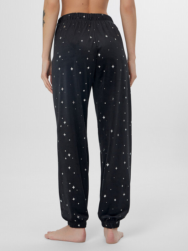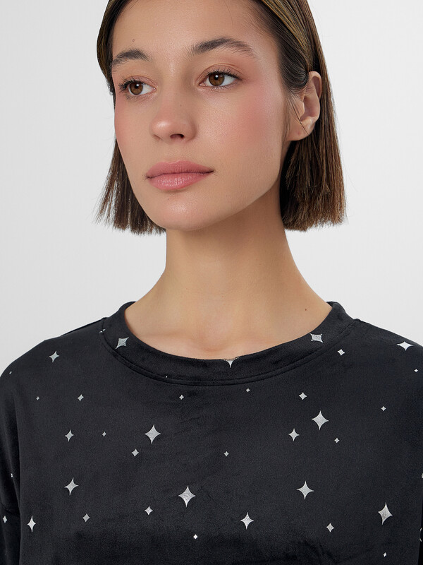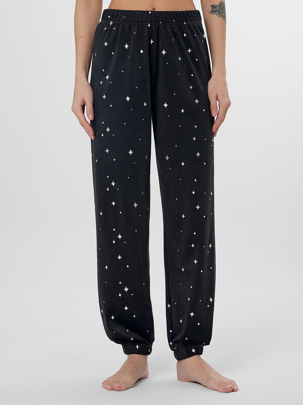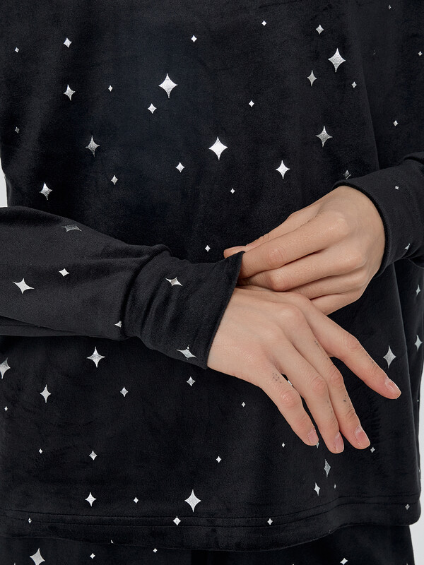 Комплект состоит из джемпера и брюк. Джемпер прямого силуэта. Горловина круглой формы, обработана обтачкой из основного полотна. Линия плеча спущена. Рукава длинные втачные . По низу рукавов отрезные манжеты из основного полотна. Низ джемпера обработан швом в подгибку на плоскошовной машине. Брюки прямые, свободные. Пояс цельнокроеный с эластичной тесьмой внутри (внутр. 40мм 40RV). По низу в шве подгибки эластичная тесьма (внутр. 30мм 30RV).