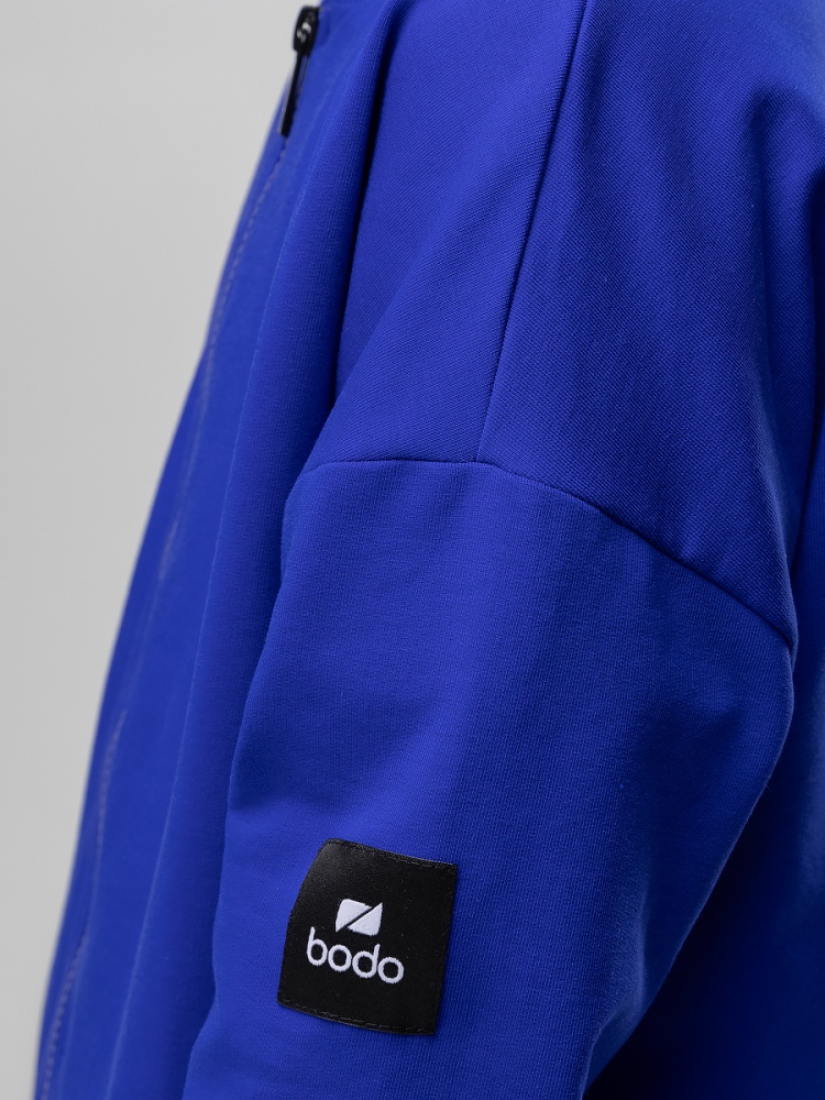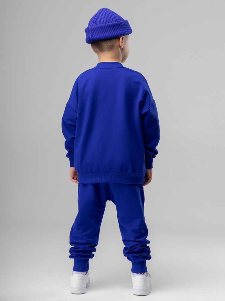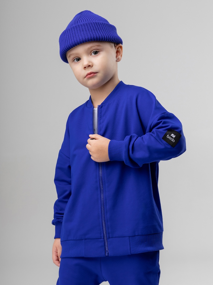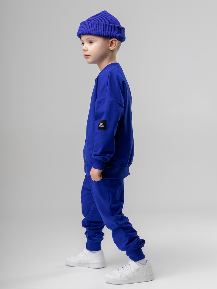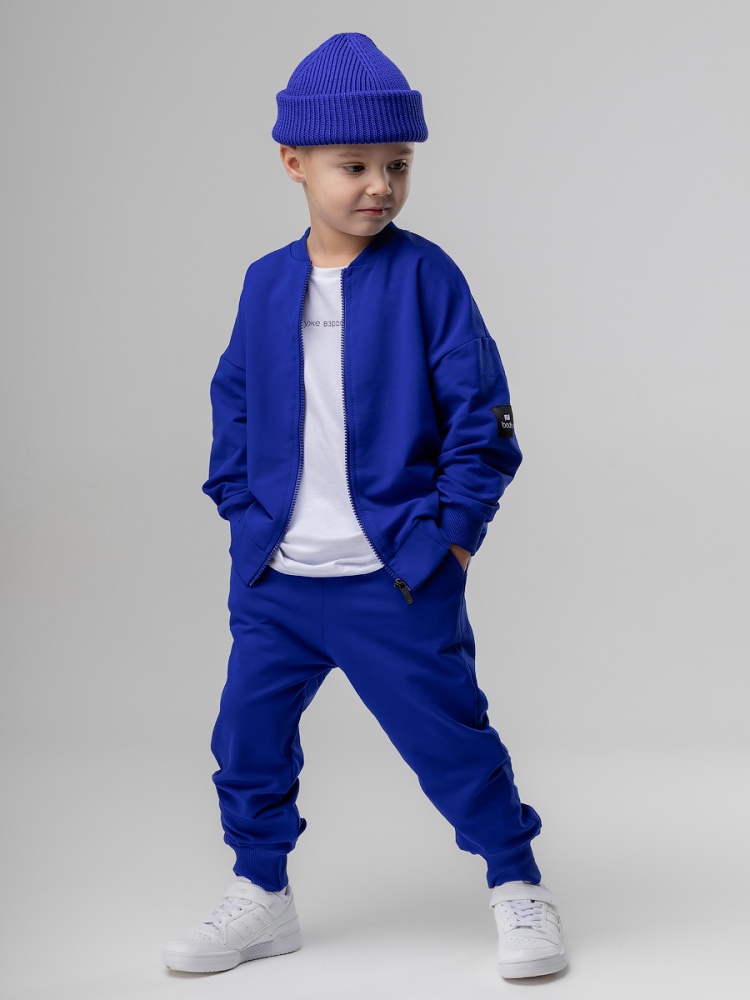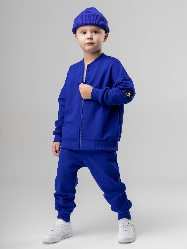 Костюм: бомбер и брюки. Свободный, прямой бомбер с центральной застёжкой на молнию, с длинными рукавами. Брюки прямые свободные на поясе с внутренней резинкой, манжет по низу.