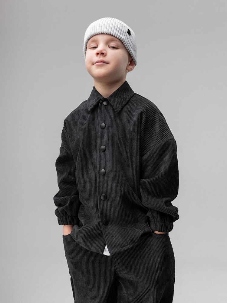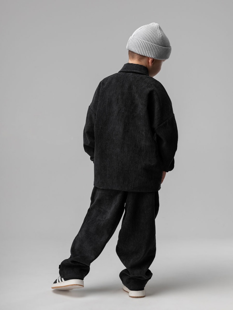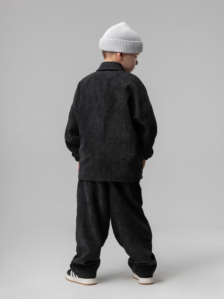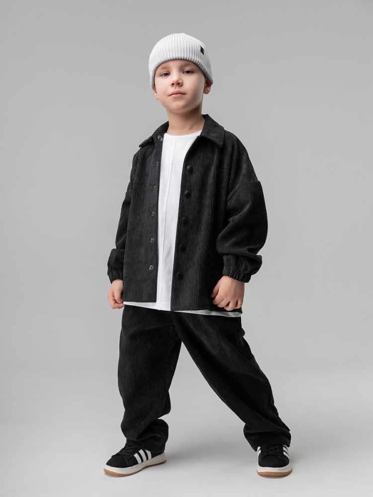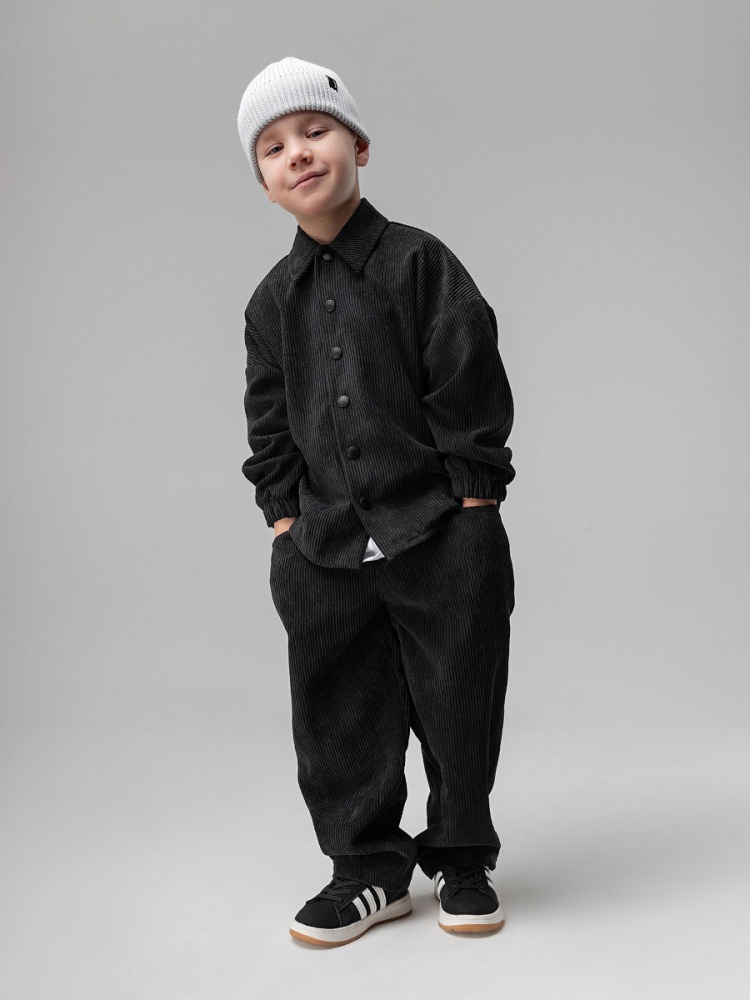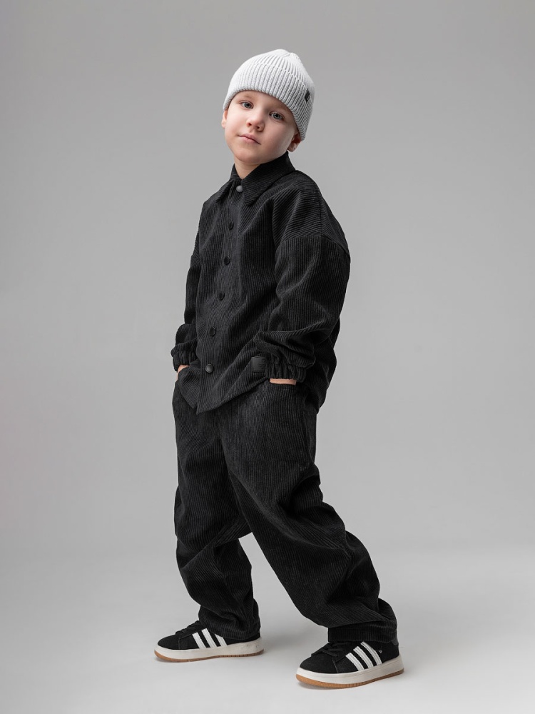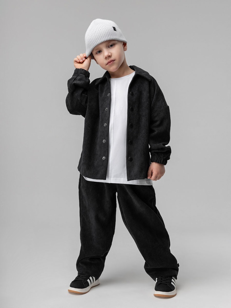 Костюм для детей дошкольного возраста. Рубашка без подкладки, прямого силуэта, с центральной бортовой застёжкой на кнопки, с отложным воротником, с втачными рукавами на резинке. Низ изделия ровный. Брюки свободного силуэта, расширенные в бёдрах и заужены к низу, на притачном поясе с внутренней резинкой, брюки с боковыми карманами. Низ изделия прямой.