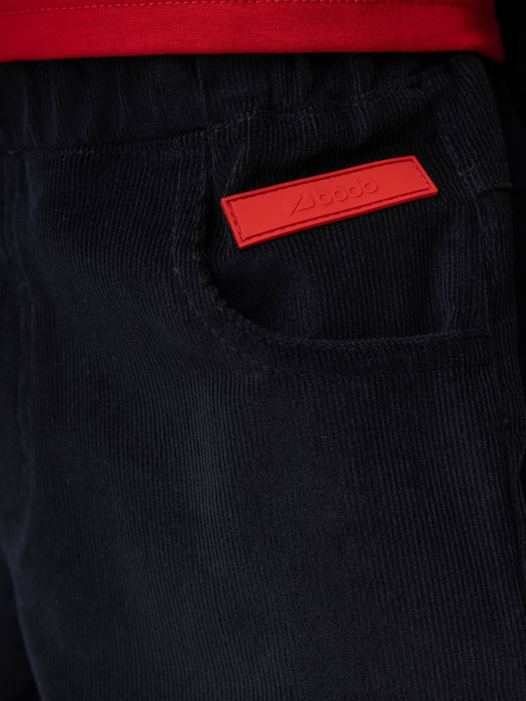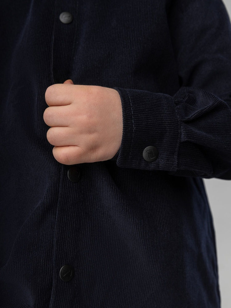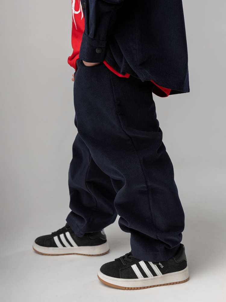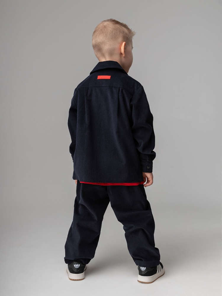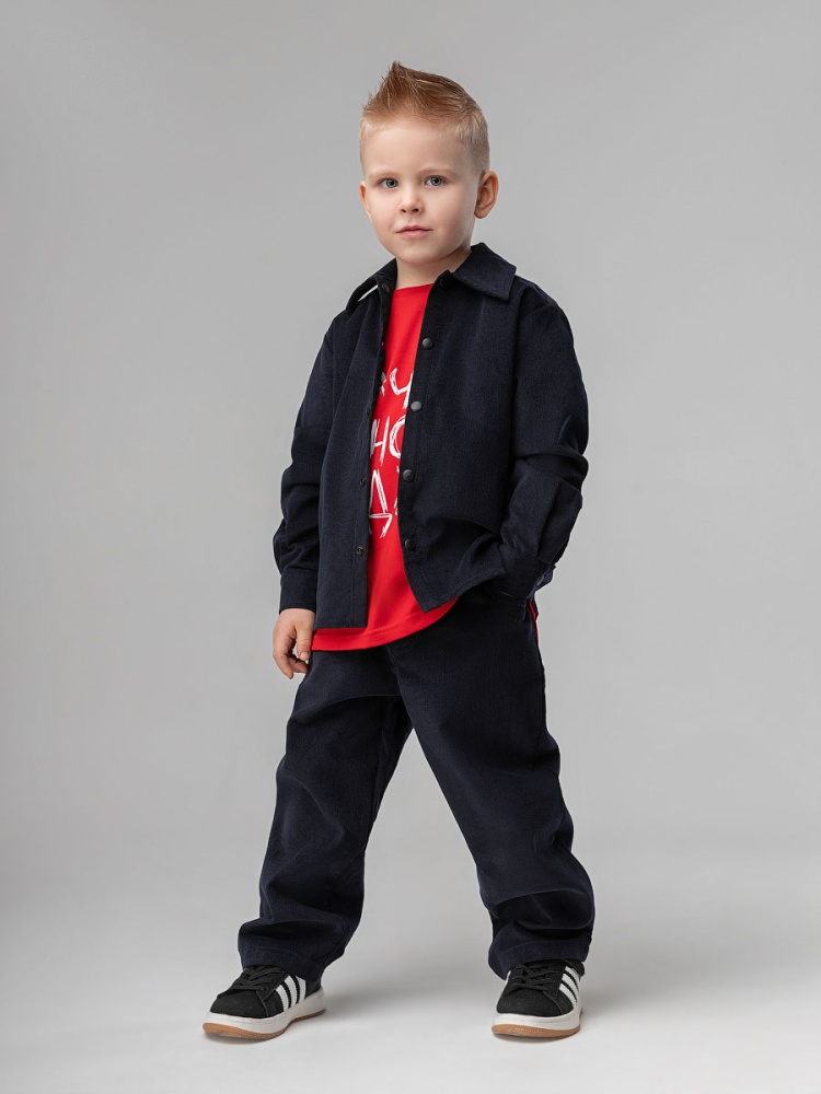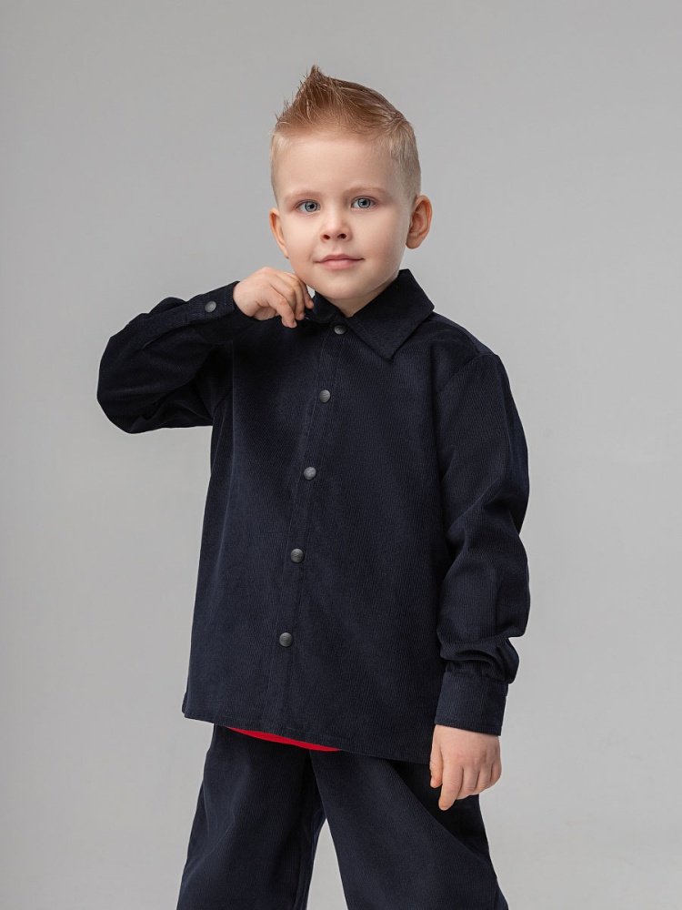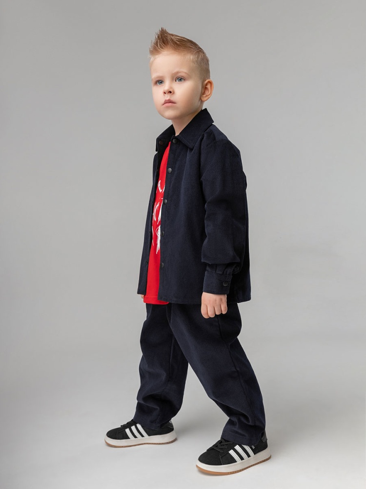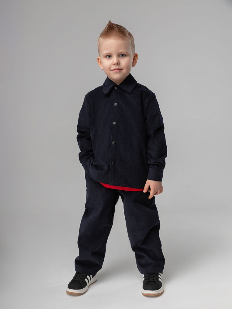 Костюм вельветовый: рубашка и брюки. Прямая рубашка без подкладки, с застёжкой на кнопки, с отложным воротником. Рукава с манжетой на кнопке. Свободные брюки, расширенные в бёдрах и заужены к низу, пояс на резинке, брюки с боковыми карманами.