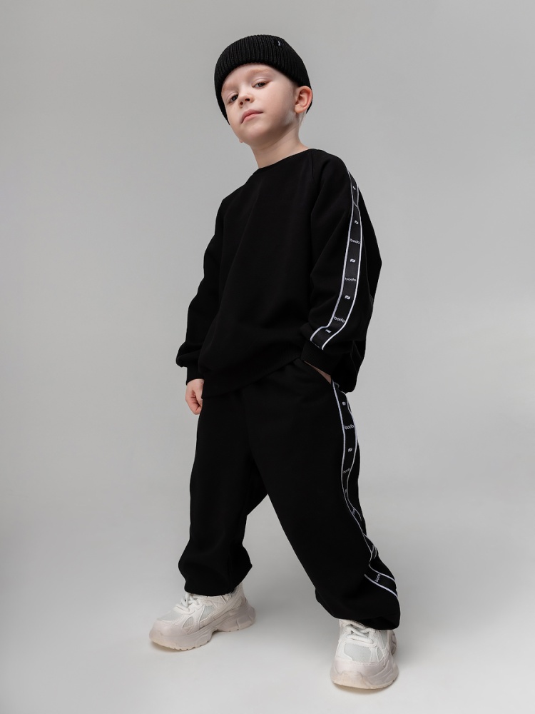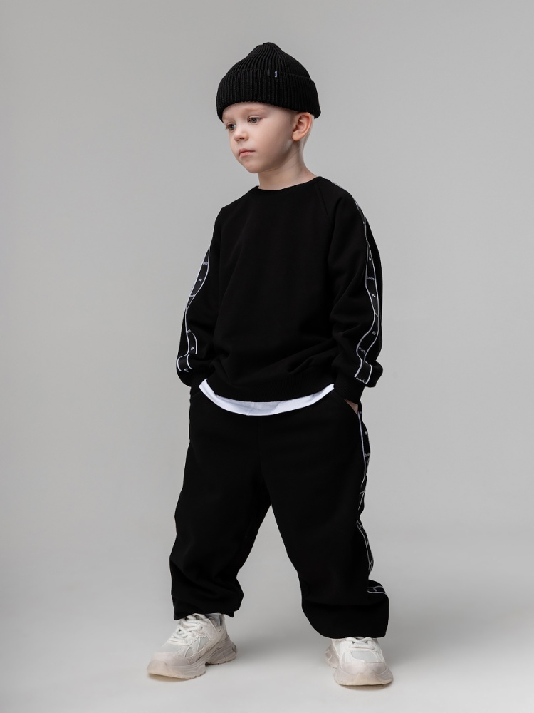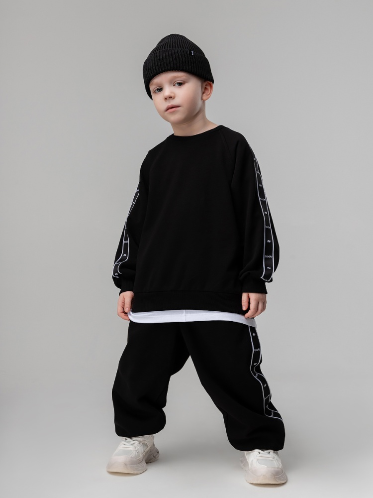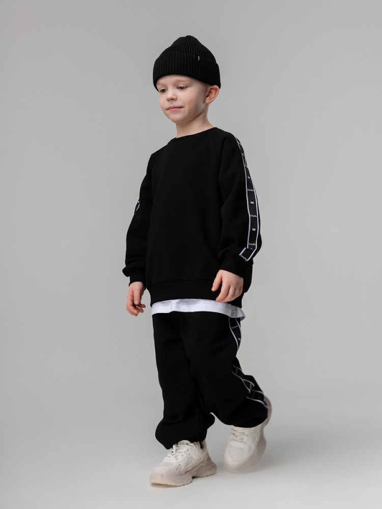Костюм для детей дошкольного возраста. Толстовка прямого силуэта, свободная с рукавом реглан и притачной манжетой. Толстовка с поясом по низу изделия. По плечу и рукаву оформлена декоративной лентой с логотипом. Брюки прямые свободные на притачном поясе с внутренней резинкой. Низ брюк с цельнокроеной манжетой на резинке. Брюки с боковыми карманами.