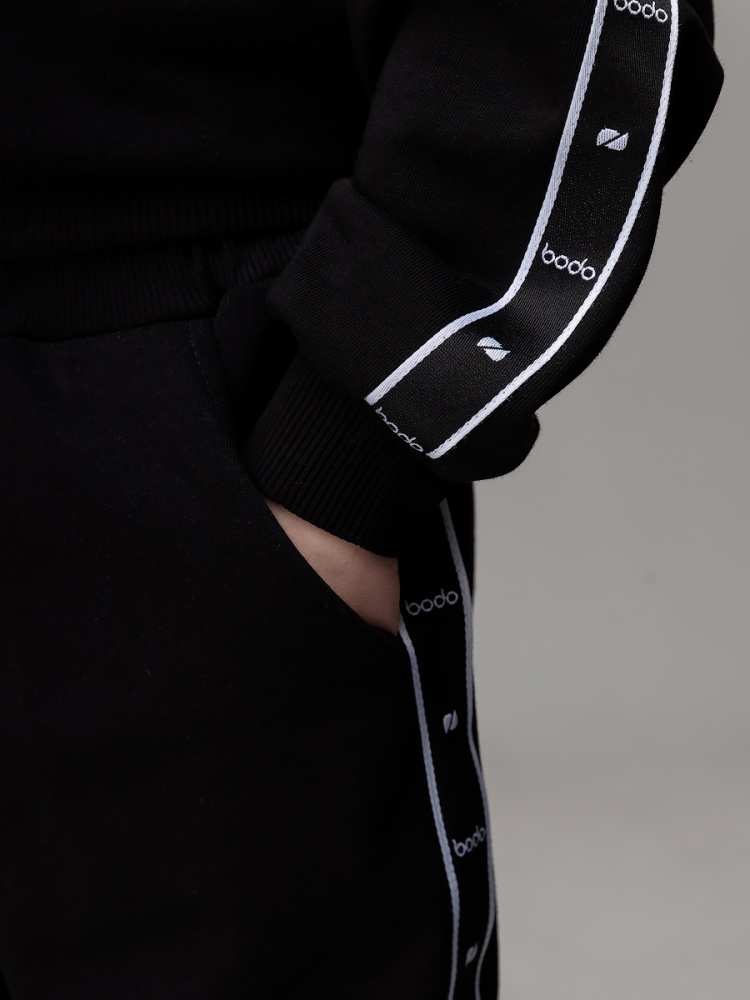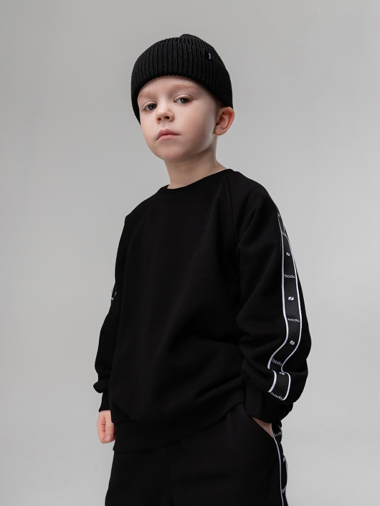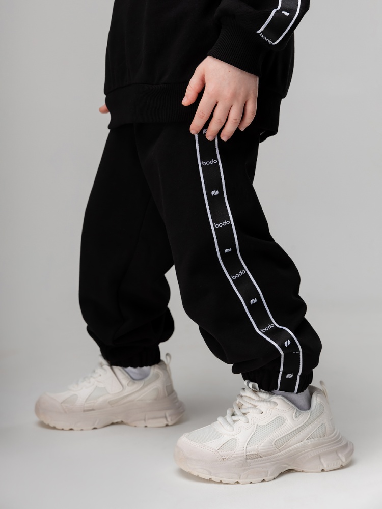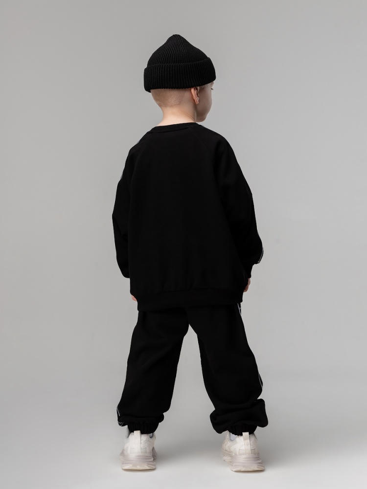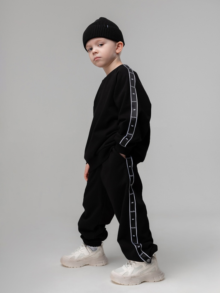 Костюм для детей дошкольного возраста. Толстовка прямого силуэта, свободная с рукавом реглан и притачной манжетой. Толстовка с поясом по низу изделия. По плечу и рукаву оформлена декоративной лентой с логотипом. Брюки прямые свободные на притачном поясе с внутренней резинкой. Низ брюк с цельнокроеной манжетой на резинке. Брюки с боковыми карманами.