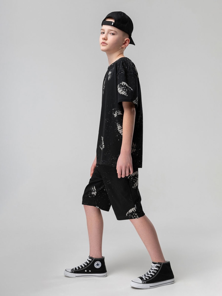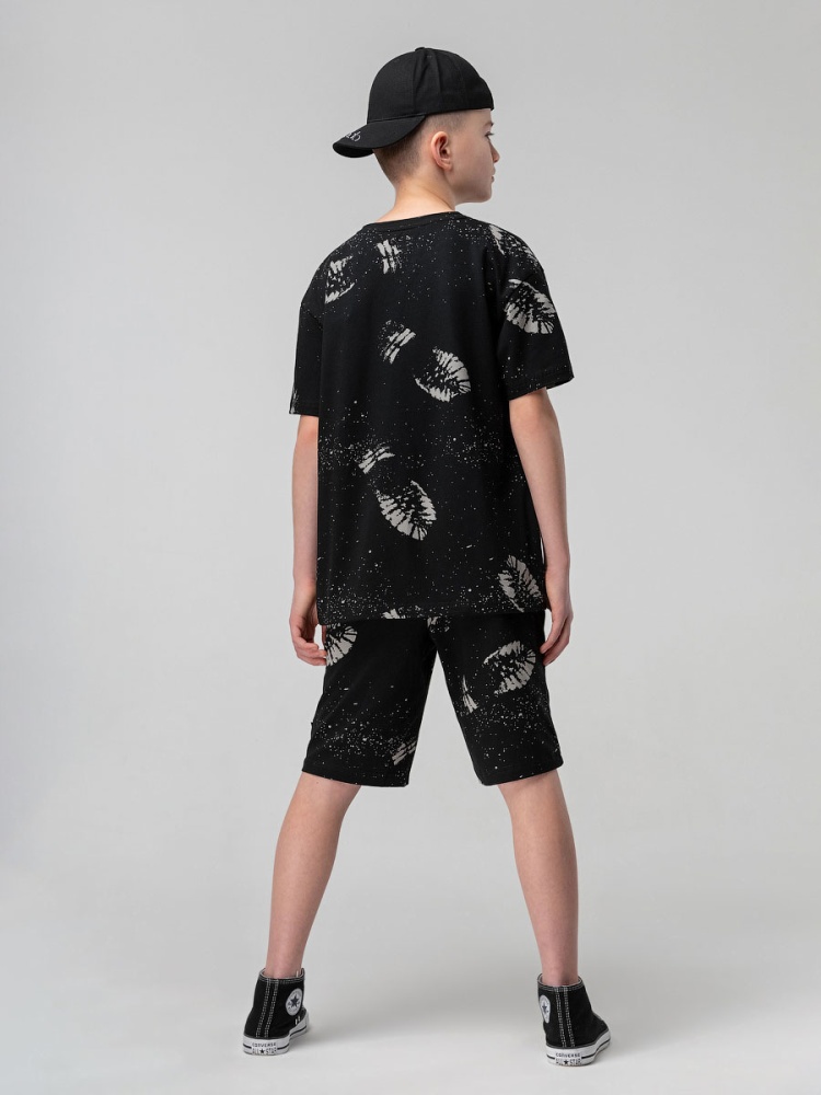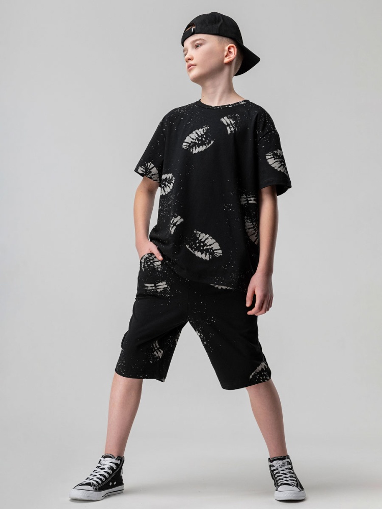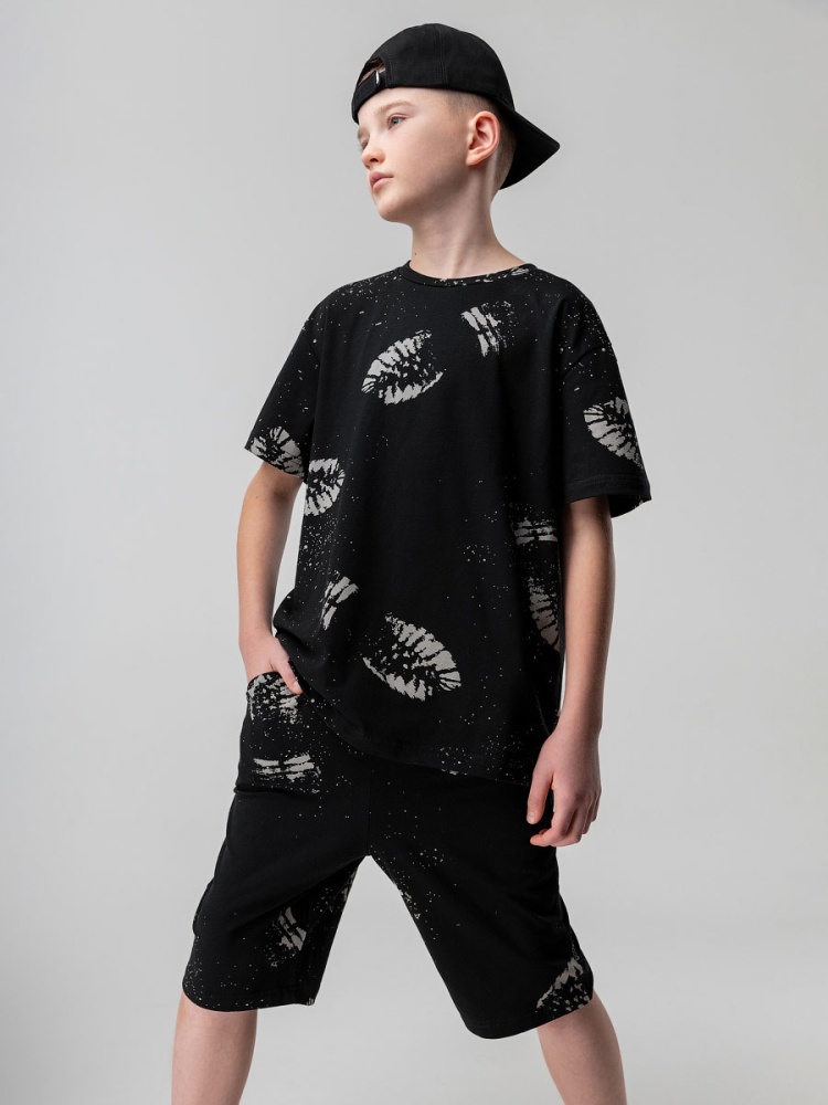 Футболка для детей школьного возраста. Футболка свободного силуэта с втачным коротким рукавом. Горловина футболки округлой формы. Низ изделия прямой.Шорты прямые свободные на притачном поясе с внутренней резинкой. Шорты с боковыми карманами.