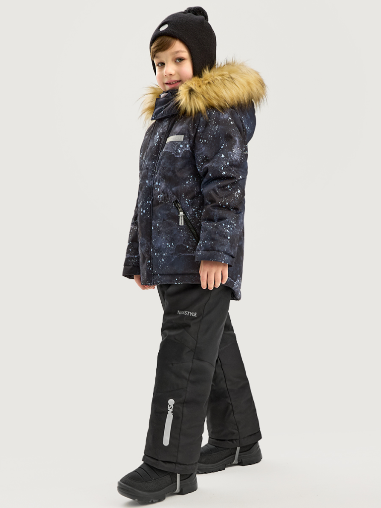 Костюм ВСЕЛЕННАЯ из мембранной ткани 5000/5000 с водо-грязеотталкивающей технологией TEFLON. Мембранная ткань это не продуваемый и водонепроницаемый материал, который надежно защищает от ветра и влаги. Благодаря дышащим свойствам мембраны ребенку будет комфортно в любую погоду, и он не вспотеет. Дополнительно на ткань нанесен светоотражающий принт. Ткань обработана снаружи экологически чистым протектором TEFLON для защиты от воды и грязи.