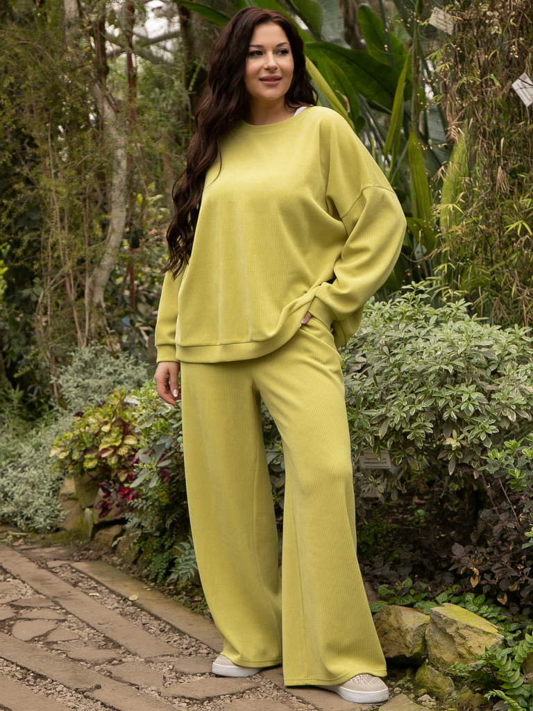 Ваш идеальный выбор для комфортных образов — костюм свободного кроя в красивом оттенке «зеленое яблоко»! Отличительная особенность этой модели — широкие брюки палаццо. Свободный крой верха и спущенный рукав создают ощущение комфорта, что особенно актуально в прохладную погоду. Брюки по талии на резинке обеспечивают дополнительный комфорт. По боковым швам расположены карманы. Этот комплект идеально подойдет тем, кто ценит свободу движений и уют без лишних деталей.