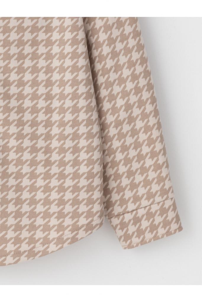 Свободная трикотажная рубашка для девочки из набивного петельчатого футера на кнопках. Модель с закругленным низом и спущенным плечом. Оригинальная набивка выполнена из стойких текстильных гипоаллергенных красителей.