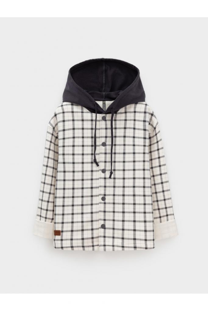 Свободная трикотажная рубашка для мальчика из мягкого петельчатого футера. В составе 80% натурального хлопка и 20% полиэстера, при этом полиэстер ввязан внутрь по особой технологии и не соприкасается с кожей. Застёгивается на кнопки. Модель с капюшоном и спущенным плечом. Рисунок в клетку выполнен из стойких текстильных гипоаллергенных красителей. Изделие сохраняет цвет и форму после многократных стирок. Все трикотажные полотна производятся в соответствии с нормами швейцарского сертификата ЭкоТекс.