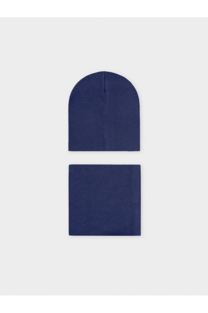 Комплект для мальчика: шапка и снуд из хлопкового трикотажа в рубчик с добавлением эластана, окрашенного стойкими гипоаллергенными текстильными красителями. Изделия хорошо тянутся, после многократных стирок сохраняют цвет и форму.