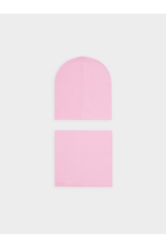 Комплект для девочки: шапка и снуд из хлопкового трикотажа в рубчик с добавлением эластана, окрашенного стойкими гипоаллергенными текстильными красителями. Изделия хорошо тянутся, после многократных стирок сохраняют цвет и форму.